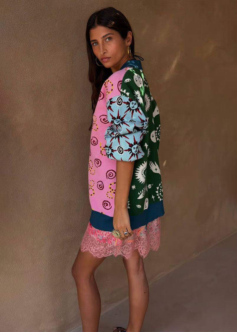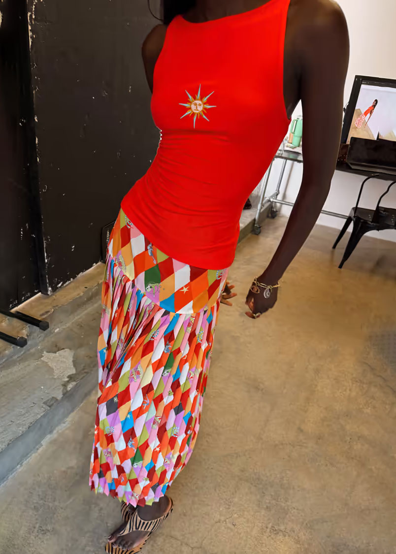 This season’s arrivals feature a dreamscape of shimmering metallic jacquards, intricate starburst embroideries, and the brand’s signature tiered silhouettes, all reimagined in a palette of cosmic jewel tones.