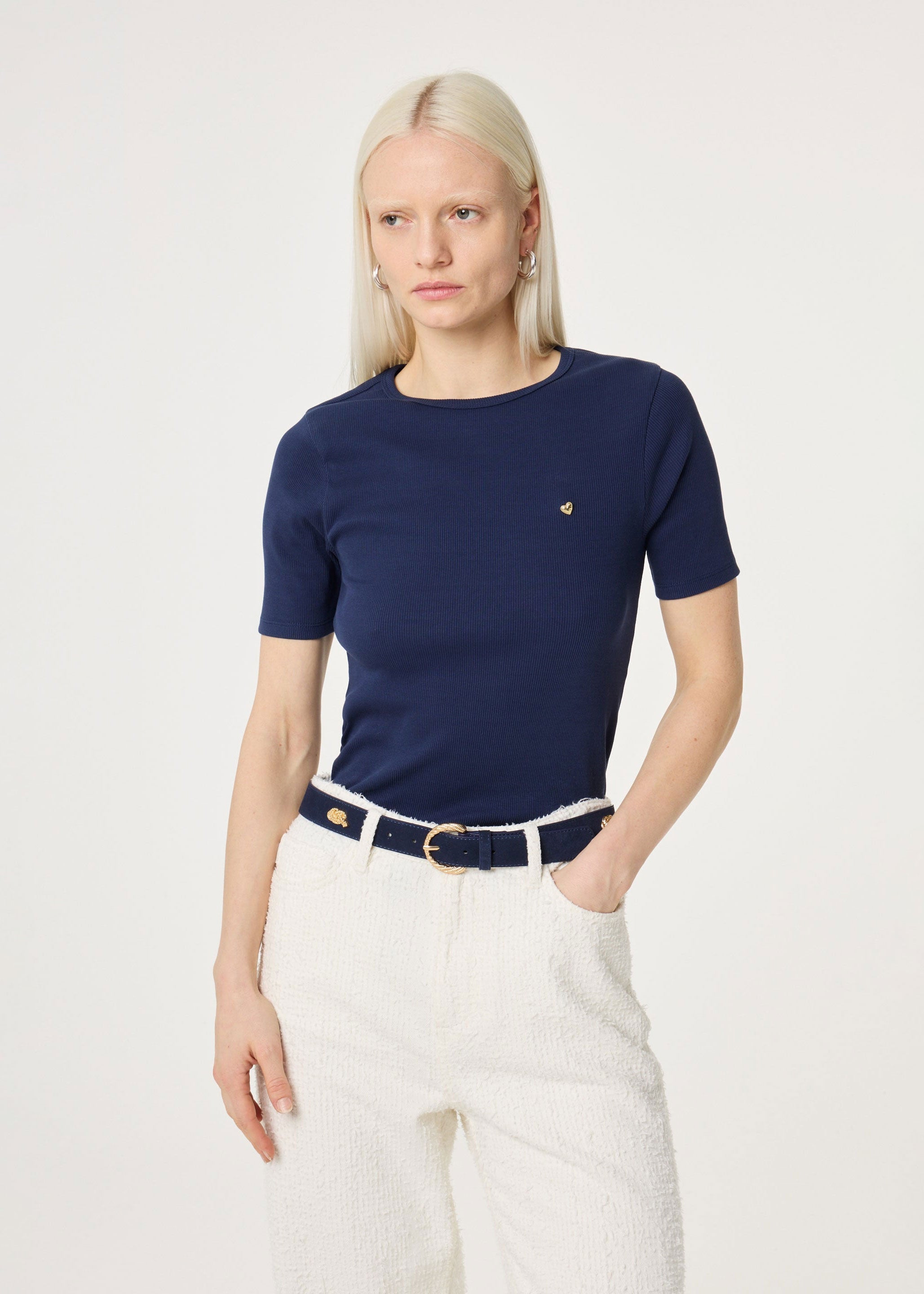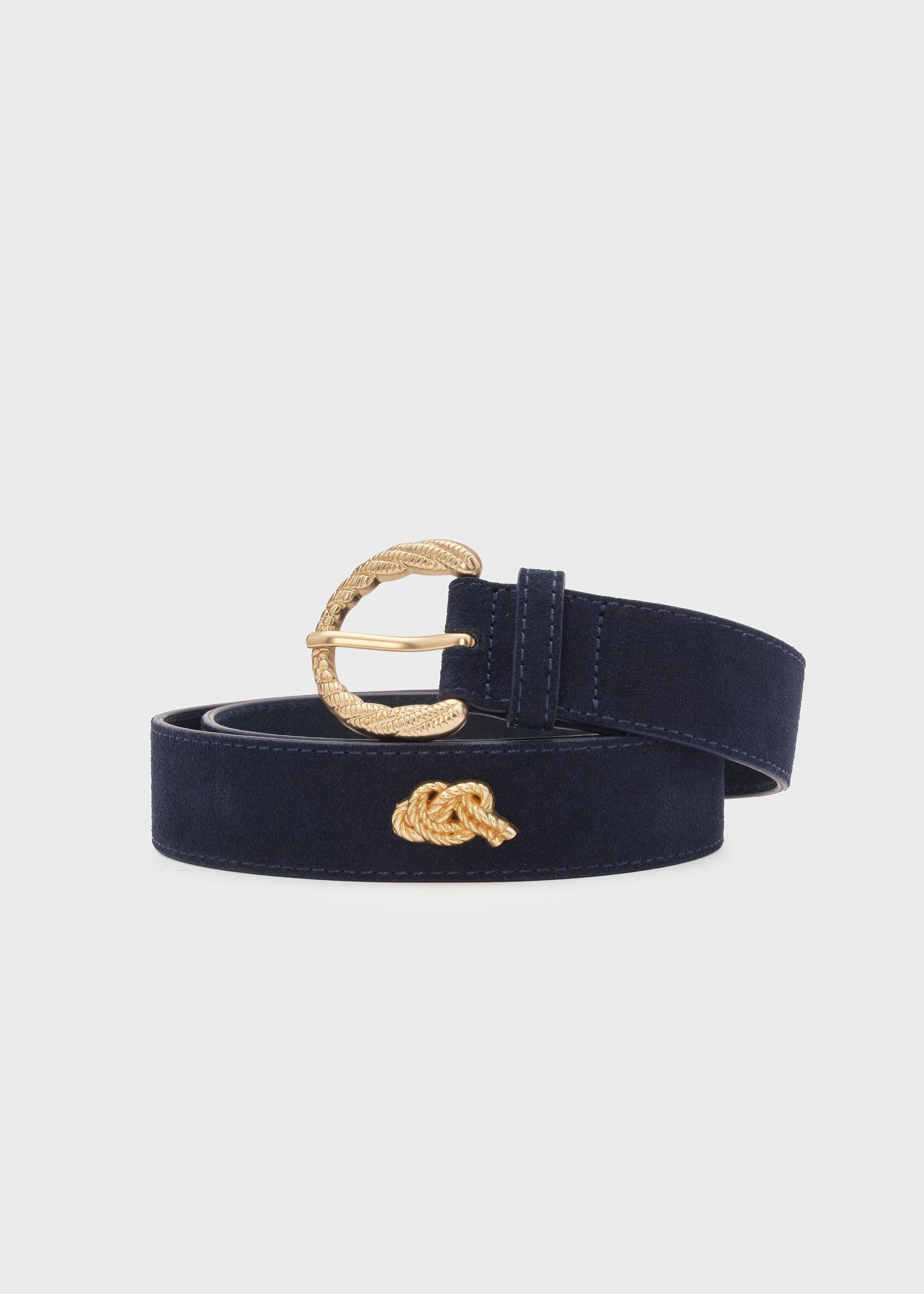 This maritime blue belt is crafted from 100% cow leather and defined by a sculptural gold rope-style buckle. Finished with a delicate knot detail, it brings a refined yet distinctive accent to both casual and dressed-up outfits.