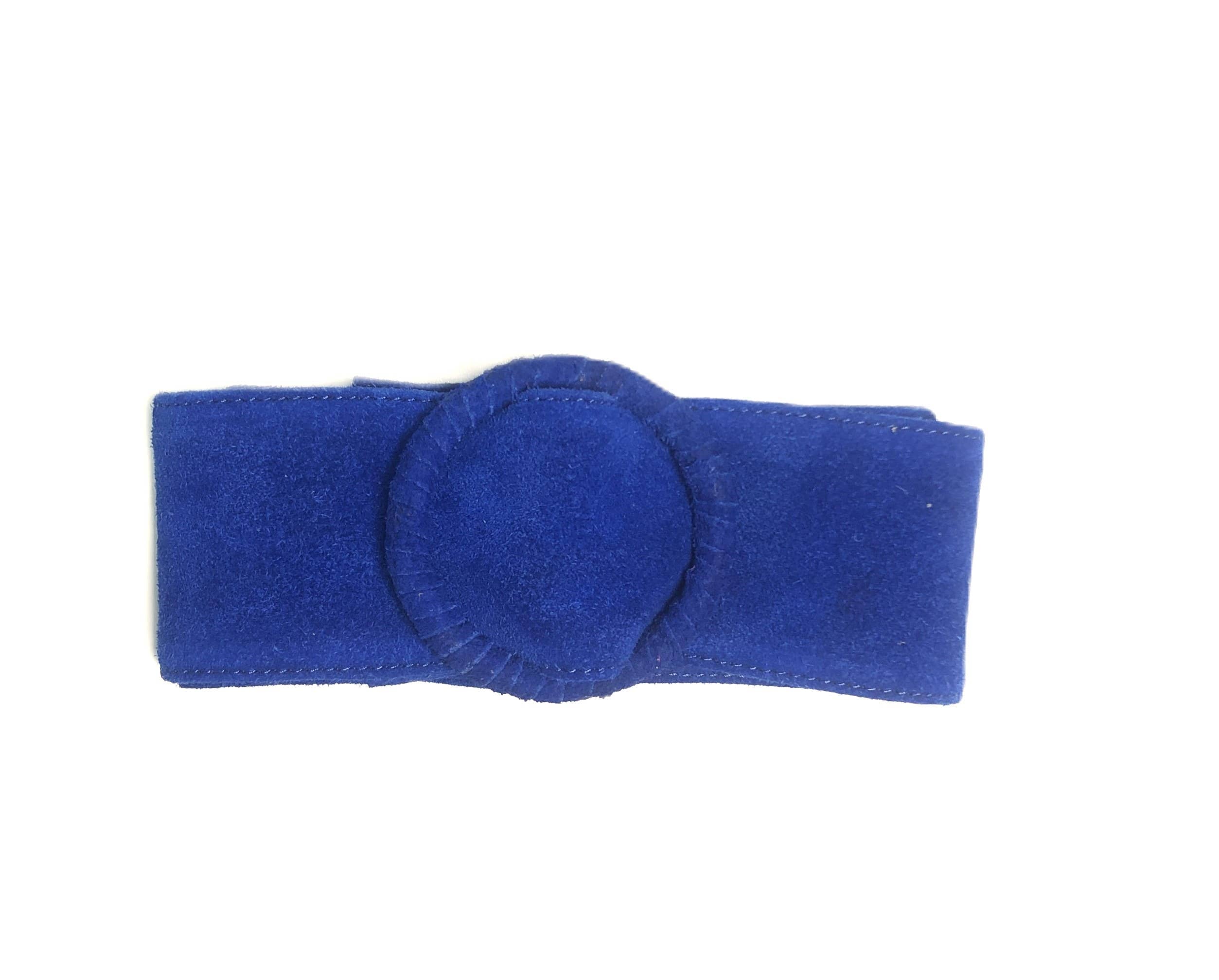 Blue Womens' Soft Silky Suede Leather Round Buckle 70mm Wide Dress Belt A wonderful blue coloured beautiful, soft, silky suede leather belt with round buckle that is wrapped in an overlapping pattern. It makes an attractive statement and adds to the look of your shirt, skirt or dress. These are one size only. Length from middle of buckle to longest point 110 cm approximately. Depth 7 cm