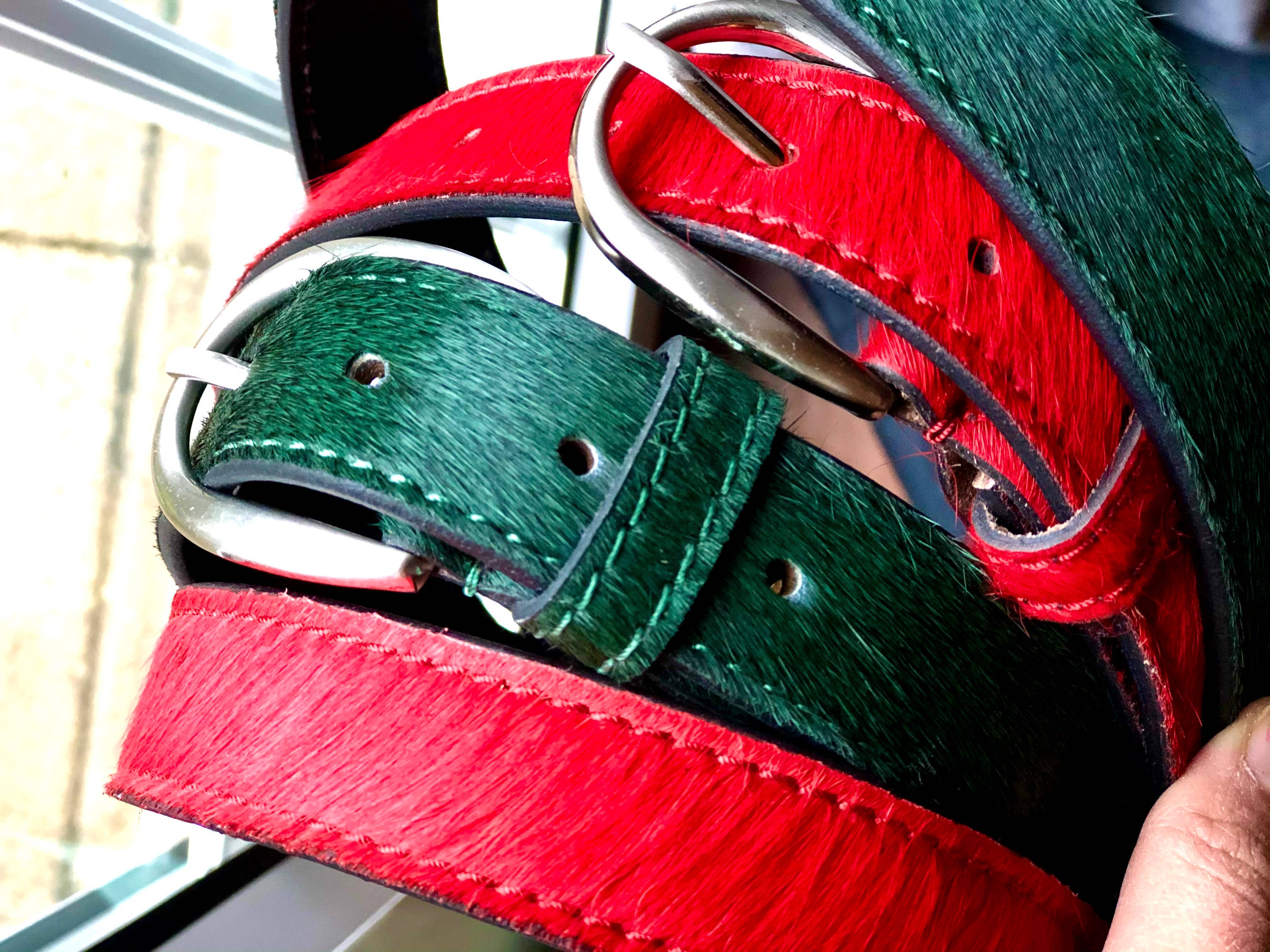 Rich bottle green coloured hair-on hide leather belts. I love these!