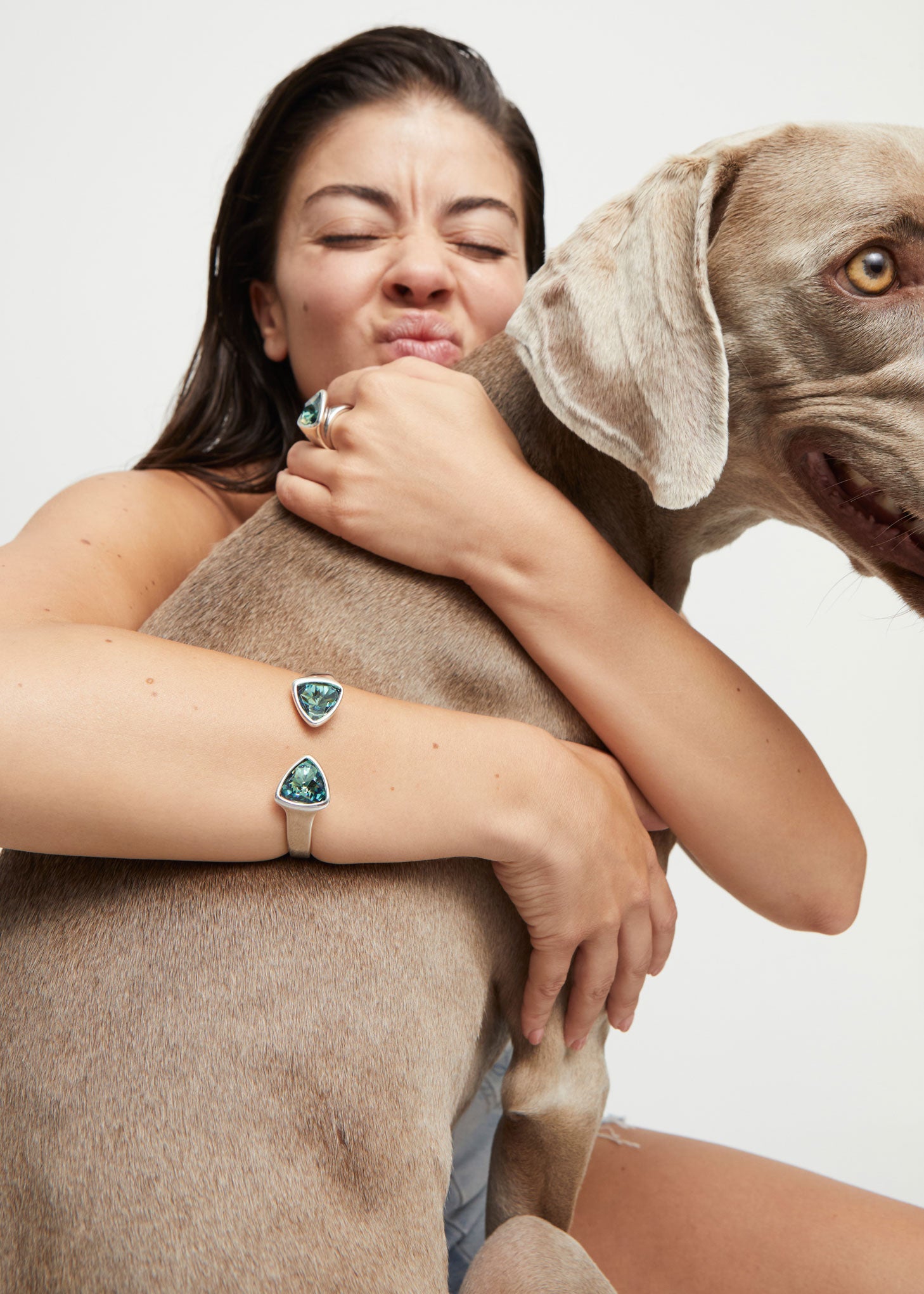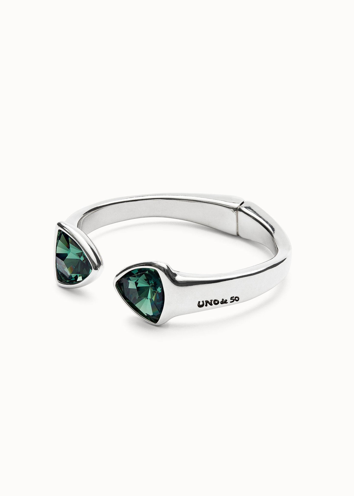 Thick sterling silver-plated bracelet with two green faceted crystals. Ser camaleónica is to adapt to everything with talent, while still being you. Is being versatile, resilient and always ready to reinvent yourself. Let your jewelry become a kaleidoscopic and change color. Nobody gets bored with you. Bring fun and dynamism to life. Like the fresh touch of the faceted crystal pieces that play with dimensions.