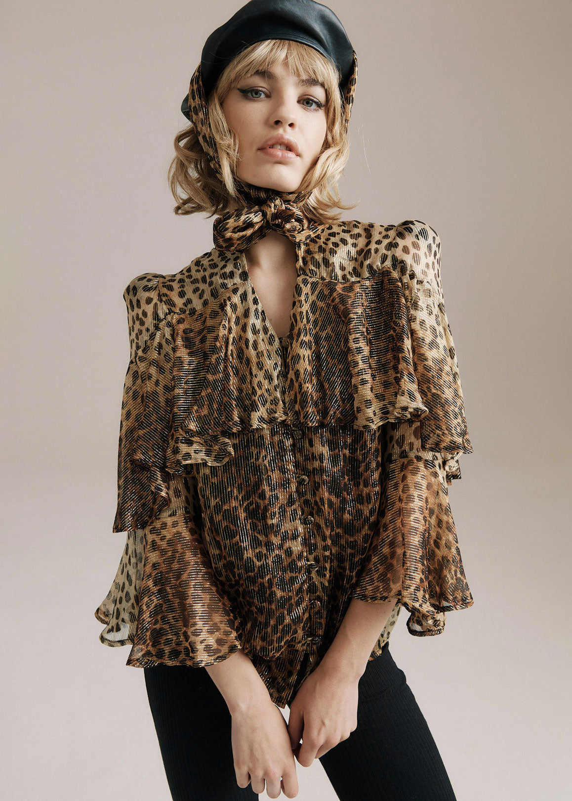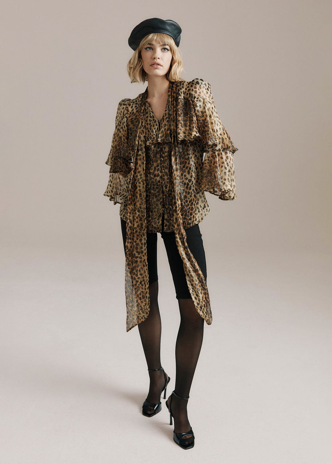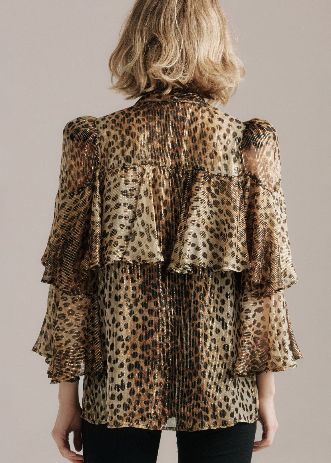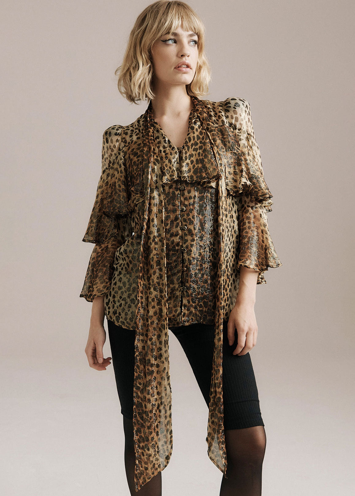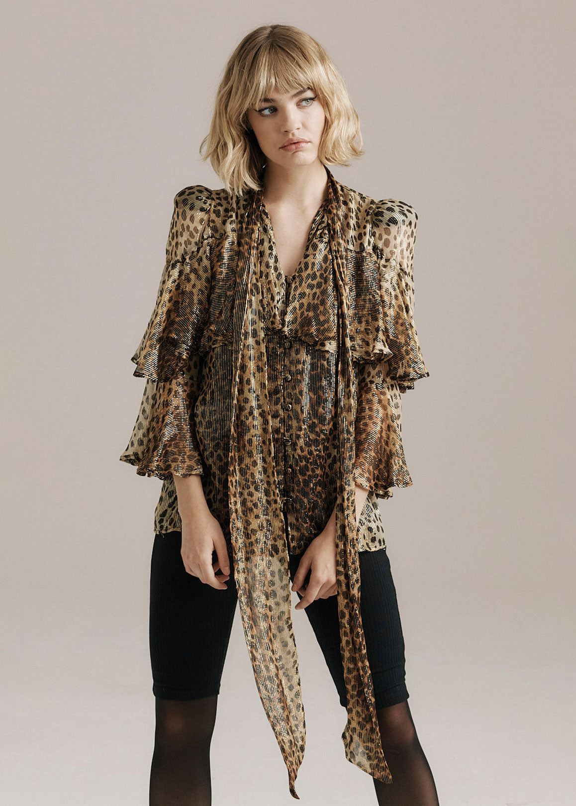 Bea combines the decadent energy of Studio 54 with unapologetic feminine flair. Crafted from sheer lurex chiffon in a bold cheetah print, the fabric catches the light with a soft, sultry shimmer. Softly gathered sleeves, cascading frills and an elongated necktie conjure vintage drama with a sense of playful confidence.