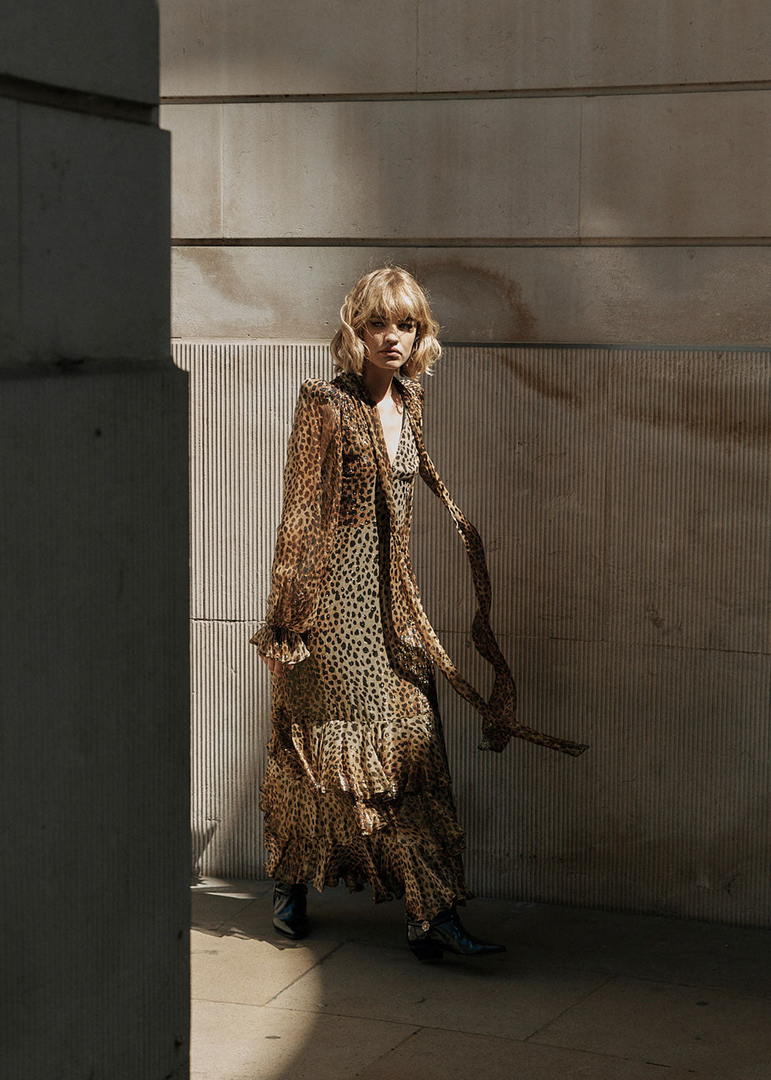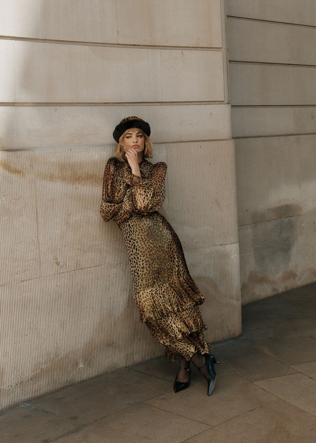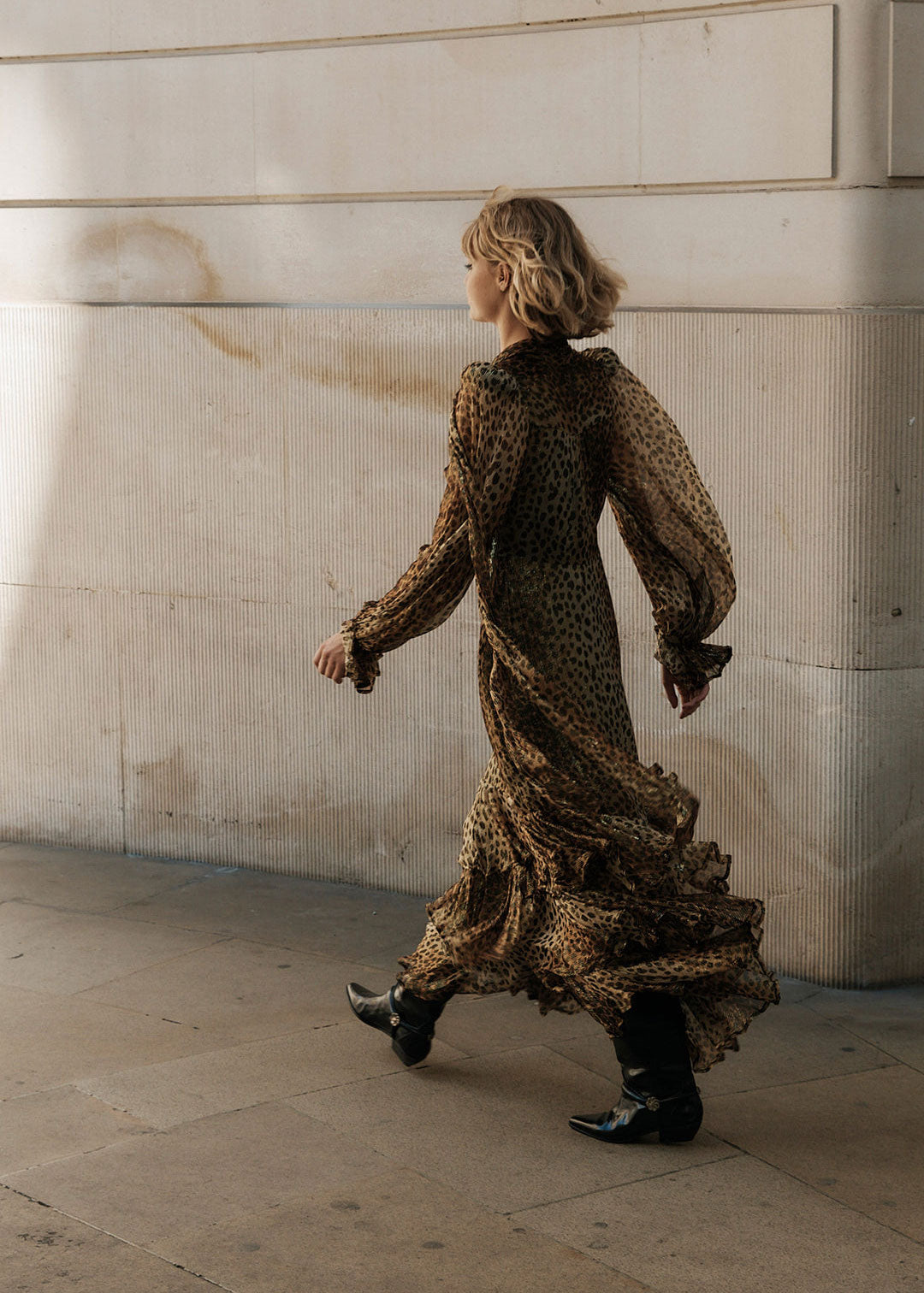 Farrah moves with untamed elegance, her cheetah print lurex chiffon catching the light in a slow, liquid shimmer. The cascading skirt sweeps the floor in rhythmic waves, while the languid self-tie neck drapes with effortless 70s glamour.