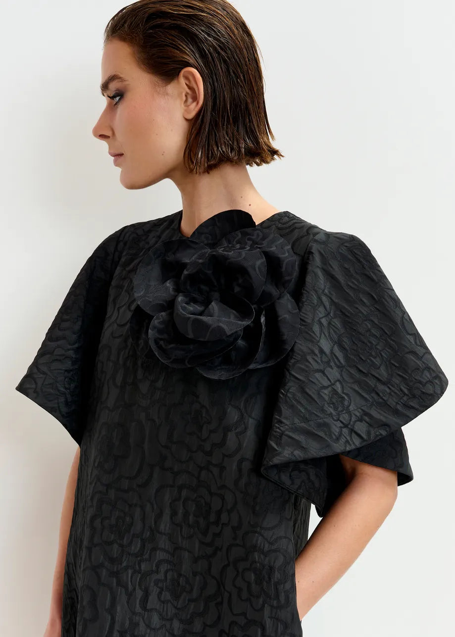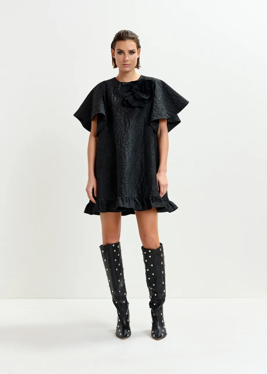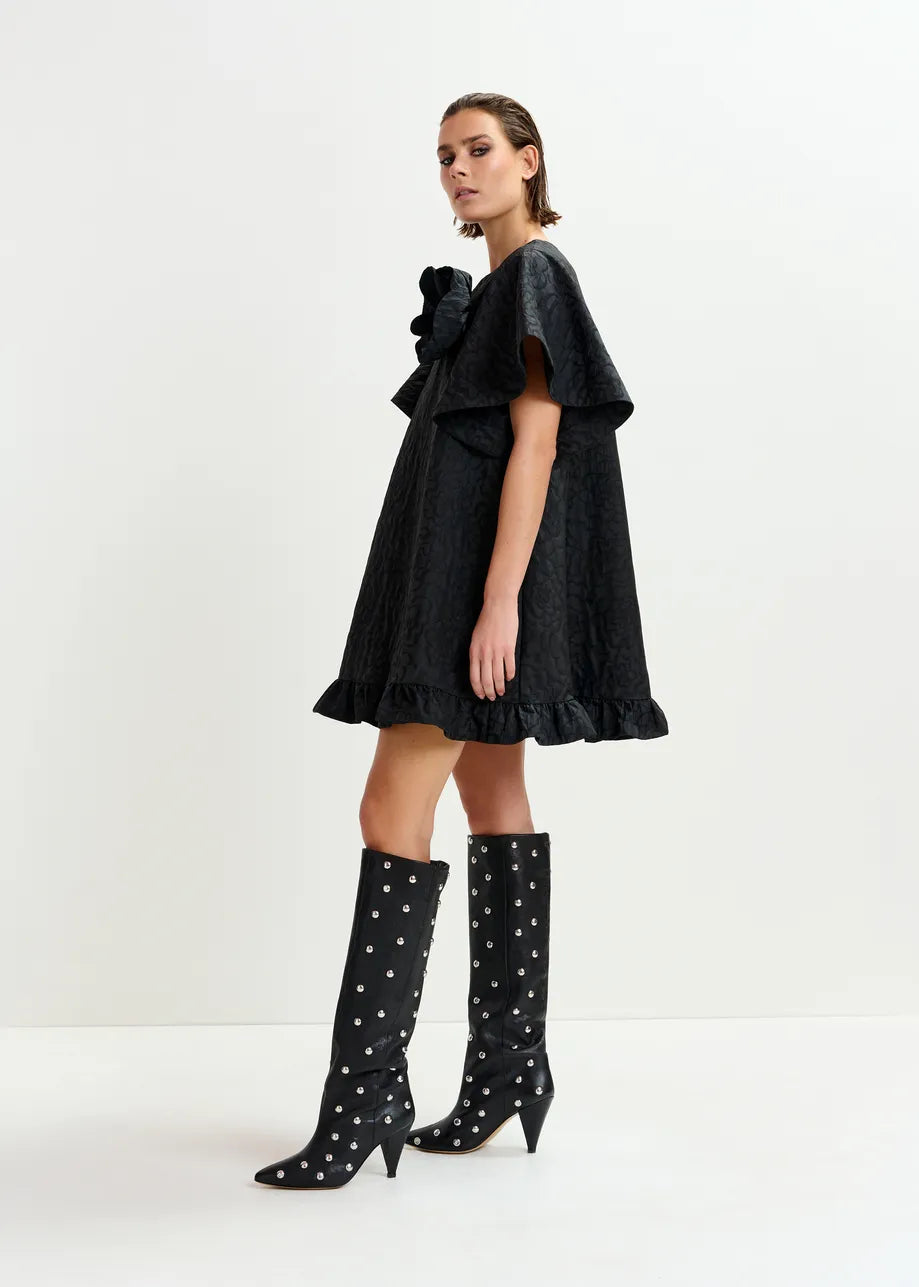 ESSENTIEL ANTWERP Black jacquard A-line mini dress with flower brooch