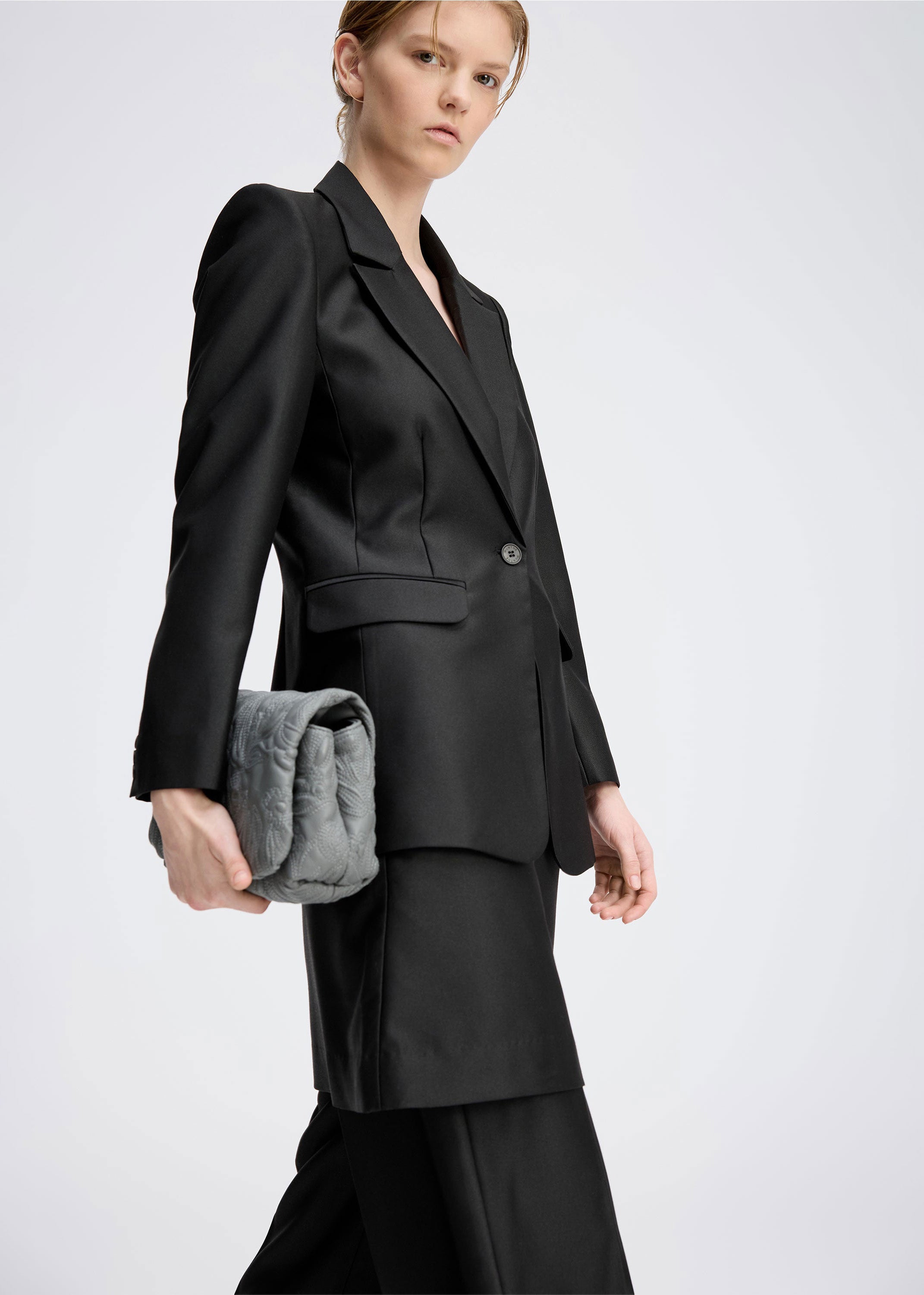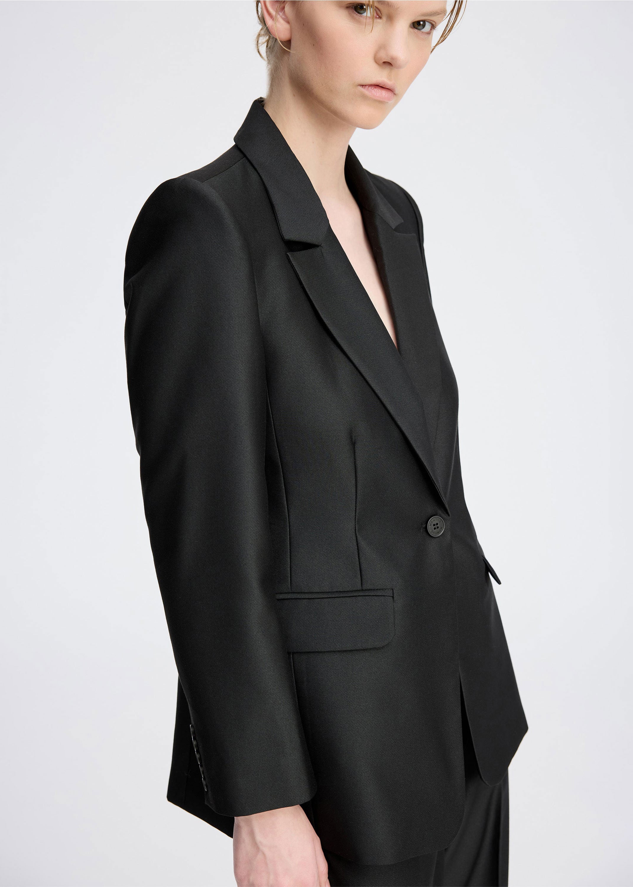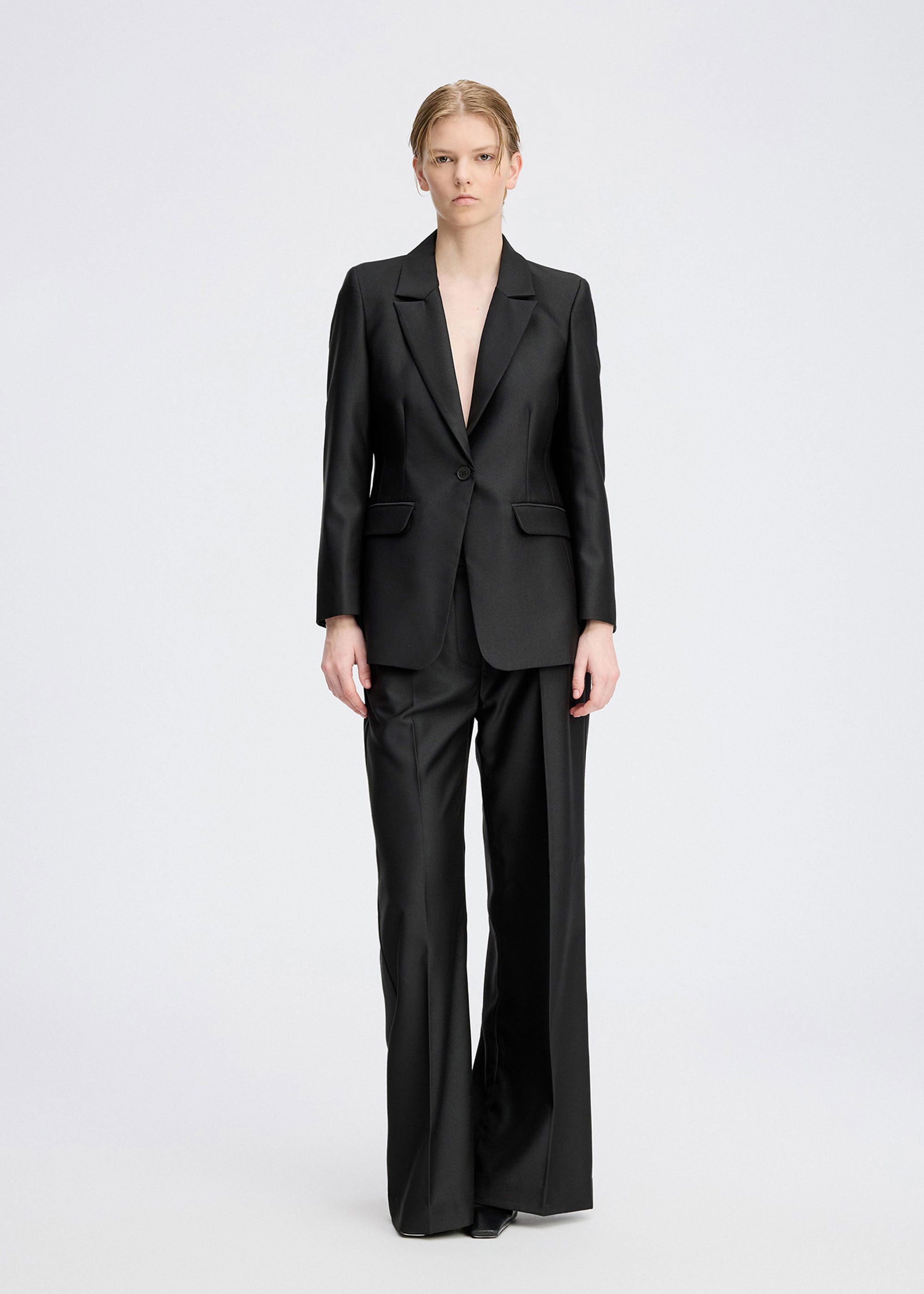 Elegant blazer in beautiful, smooth woven fabric. Designed with a classic lapel, single-button closure, and front flap pockets. The lightly tailored fit creates a sophisticated and timeless look.