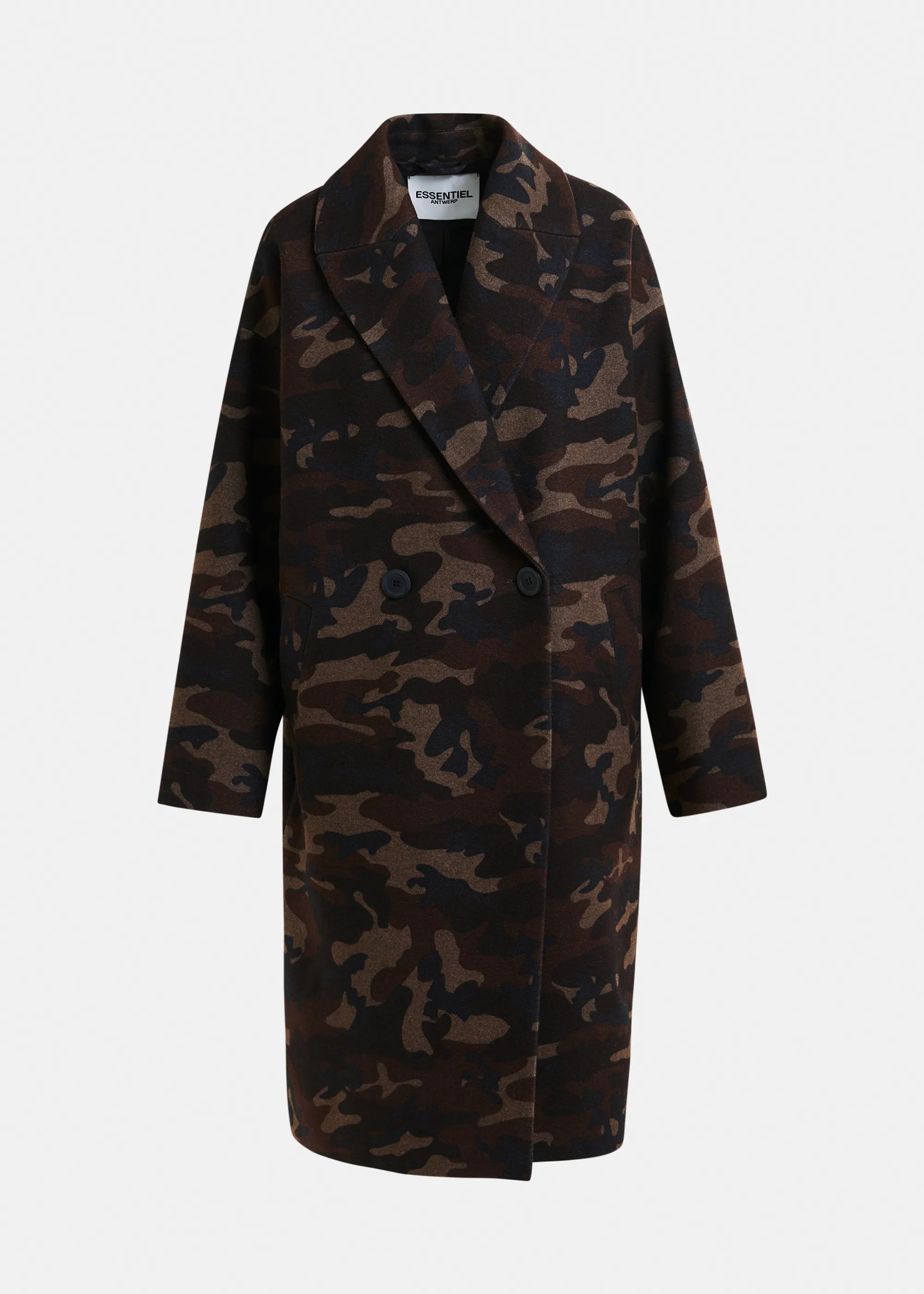 ESSENTIEL ANTWERP Khaki, beige and black camouflage print double-breasted wool-blend coat