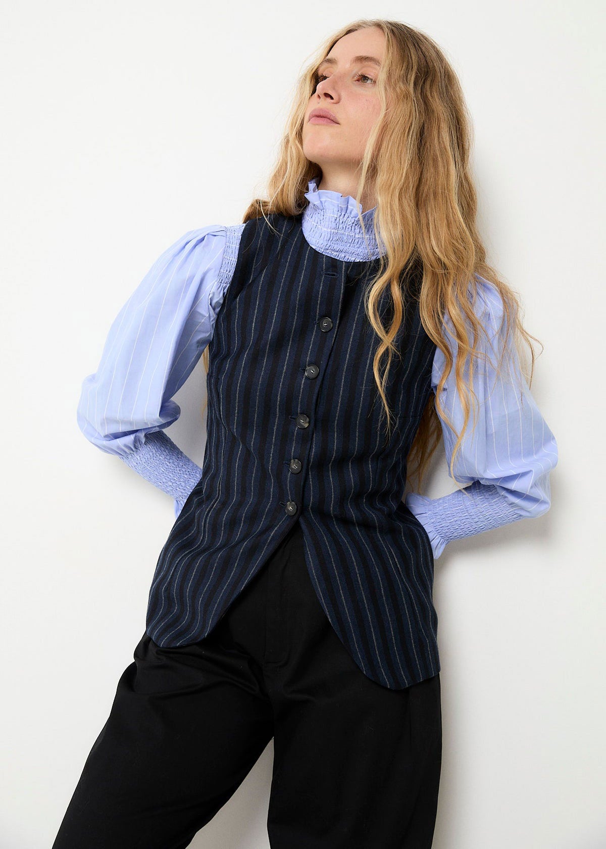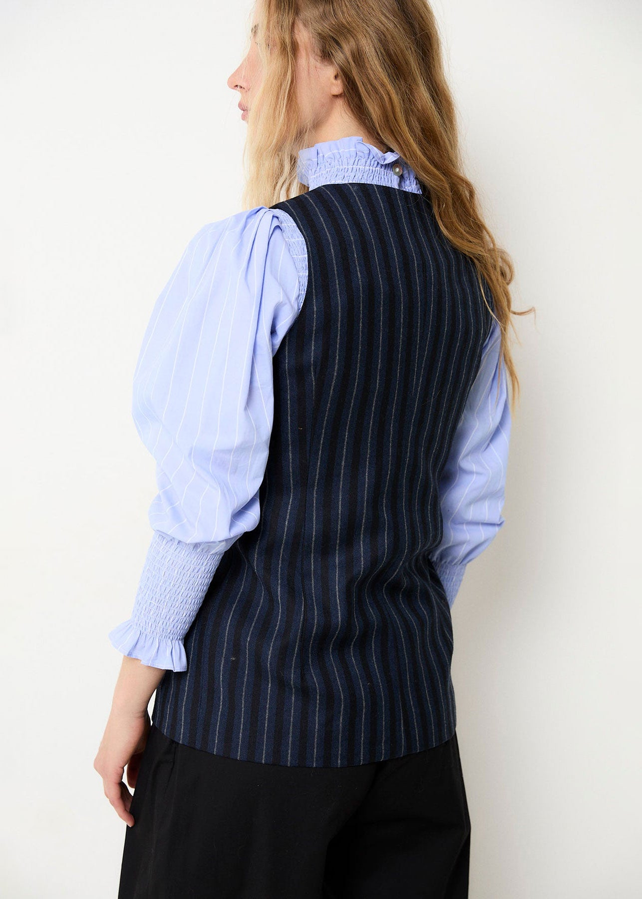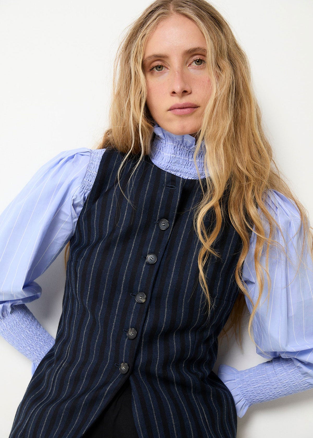 Fitted pinstriped waistcoat in shades of blue. It has a round neckline, front closure with dark buttons and a V-shaped hem. Its structured cut enhances the figure and gives it an elegant and classic look.