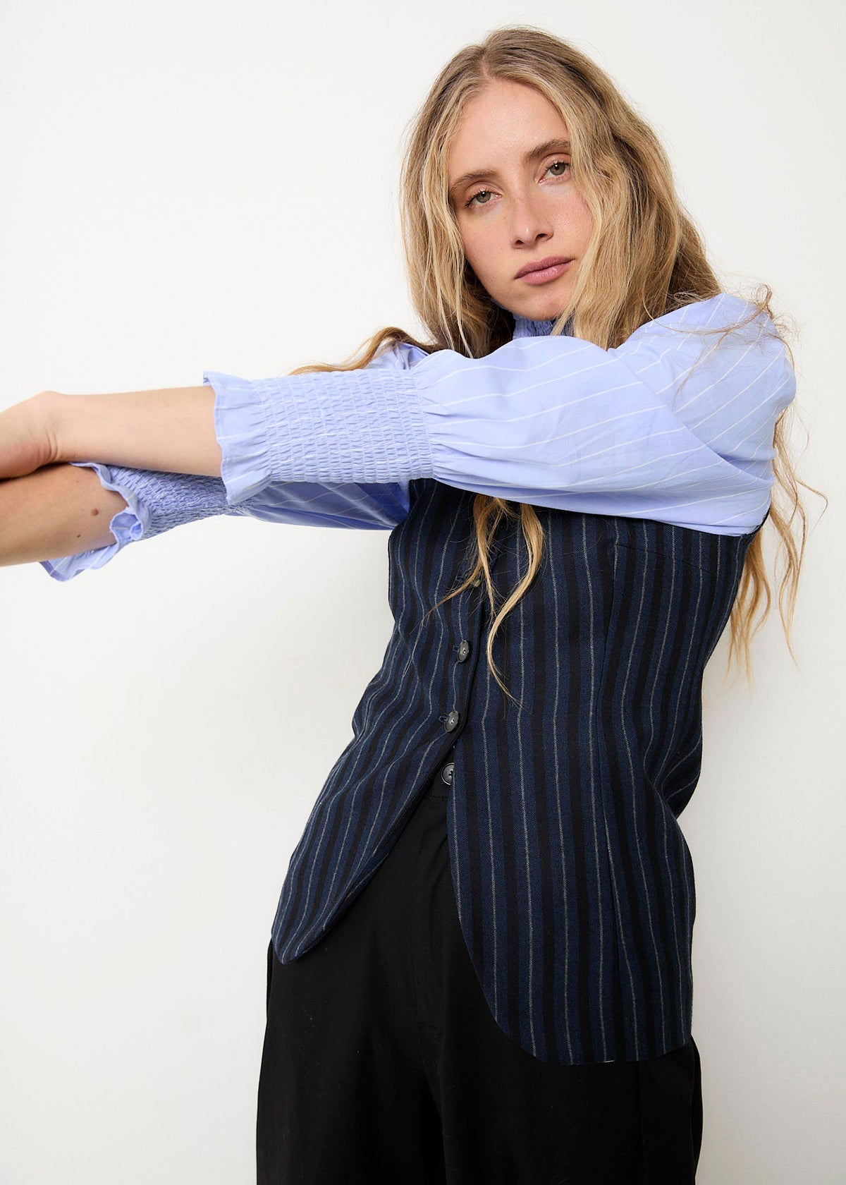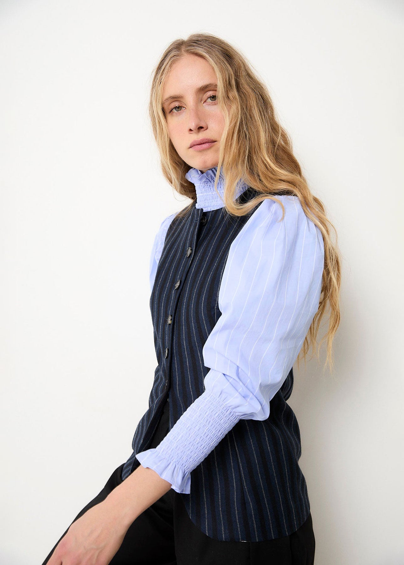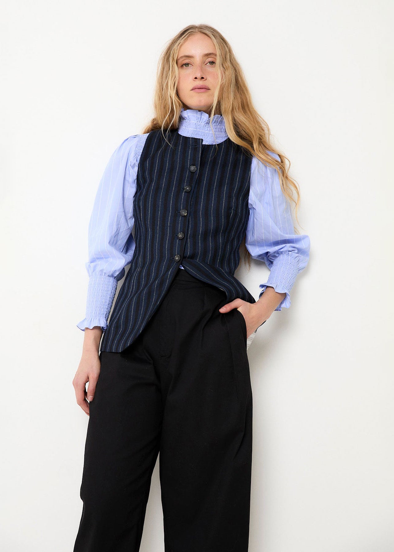 Fitted pinstriped waistcoat in shades of blue. It has a round neckline, front closure with dark buttons and a V-shaped hem. Its structured cut enhances the figure and gives it an elegant and classic look.