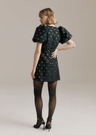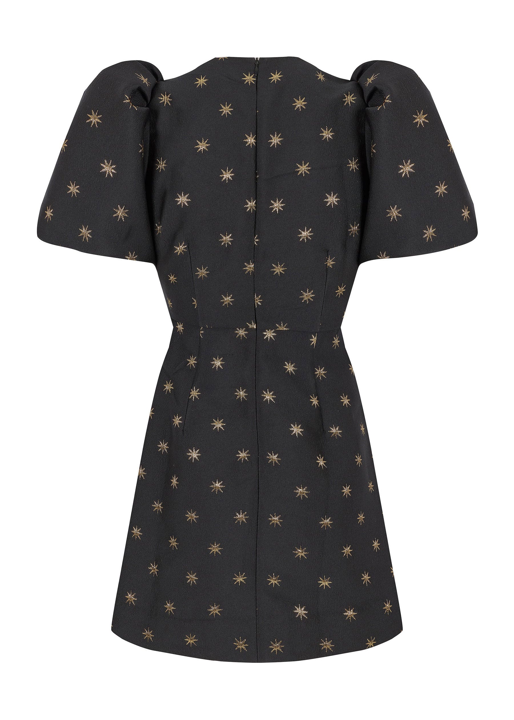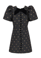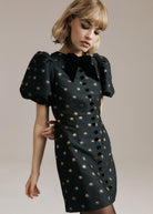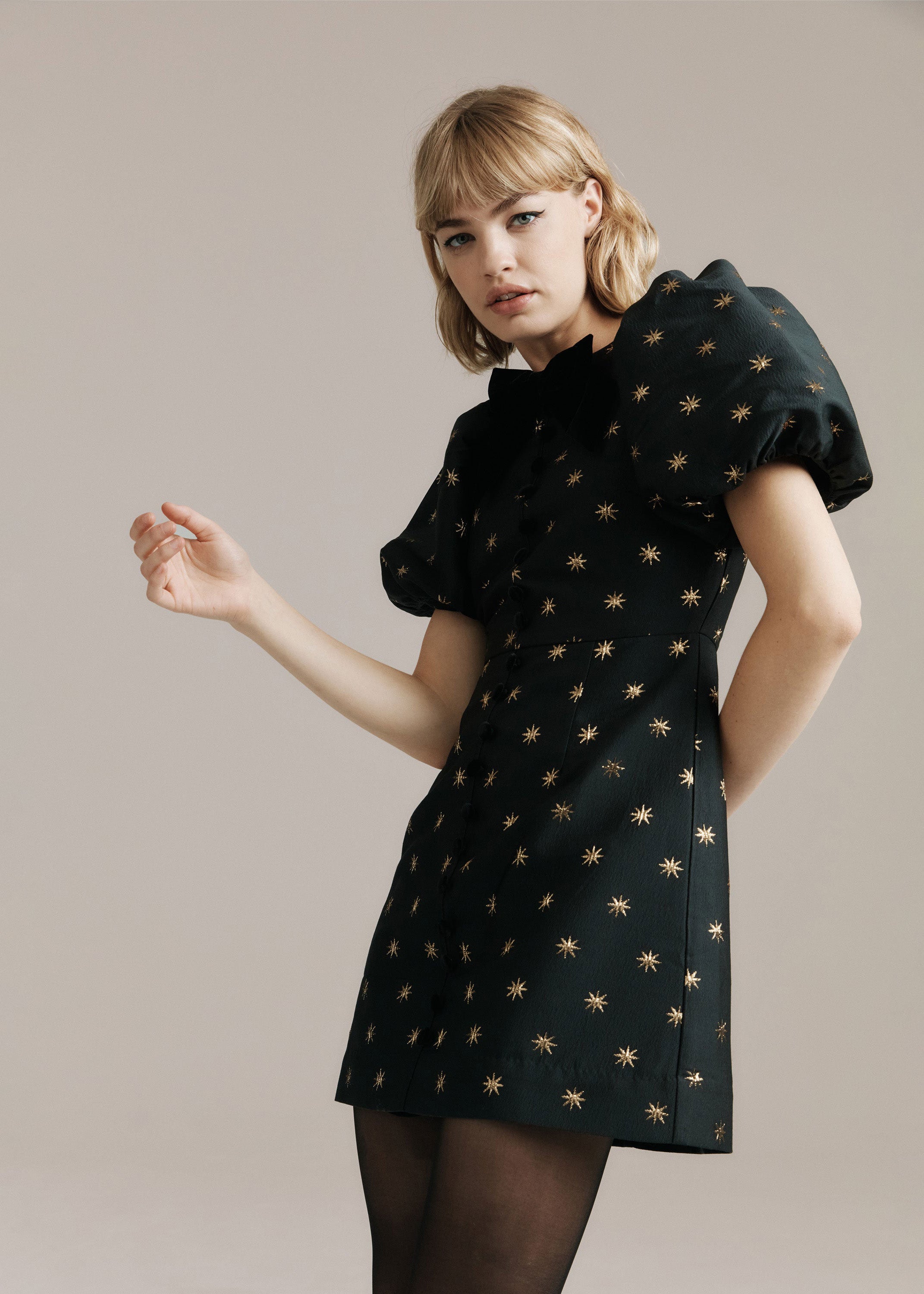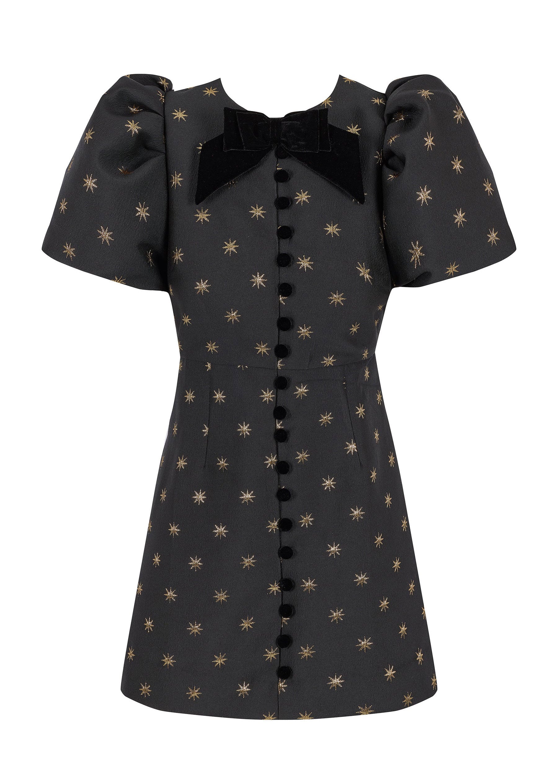 Audrey takes the timeless 60s silhouette and spins it into something celestial. Cut in deep midnight jacquard scattered with shimmering golden stars, she balances structured elegance with playful detail. A trail of velvet-covered buttons runs down the front, leading to an oversized velvet bow at the neckline that adds a touch of drama and charm.
