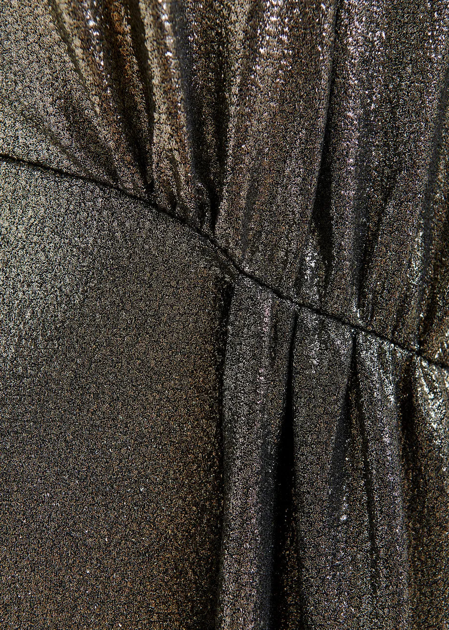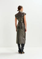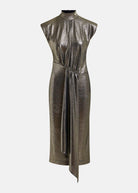 Midi dress is cut from a lurex fabric that is scattering for a glamorous, light-catching finish. It has a figure-hugging fit at the waist before falling to a wrap-inspired skirt with box pleat gathering at the front. The lightly padded shoulders and mock neck complete the design.