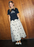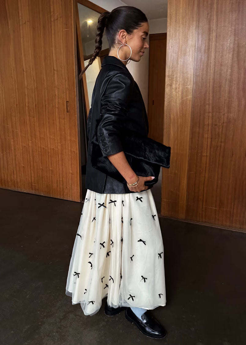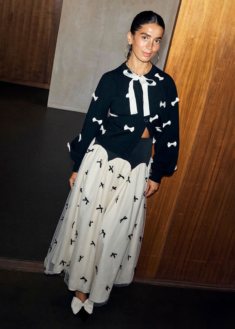 Our monika dresses were so loved that we had to recreate the silhouette in as a skirt! This time we've created the base in jersey that still that cinches your waist but adds comfortability, which then drapes, from the scalloped edging, into a gorgeous pleated tulle mesh skirt. We've also embellished the front of the skirt with tiny bows that look so chic and elevate the simple silhouette. Keep it simple and pair with a classic black tee and pumps for an effortless day out look.