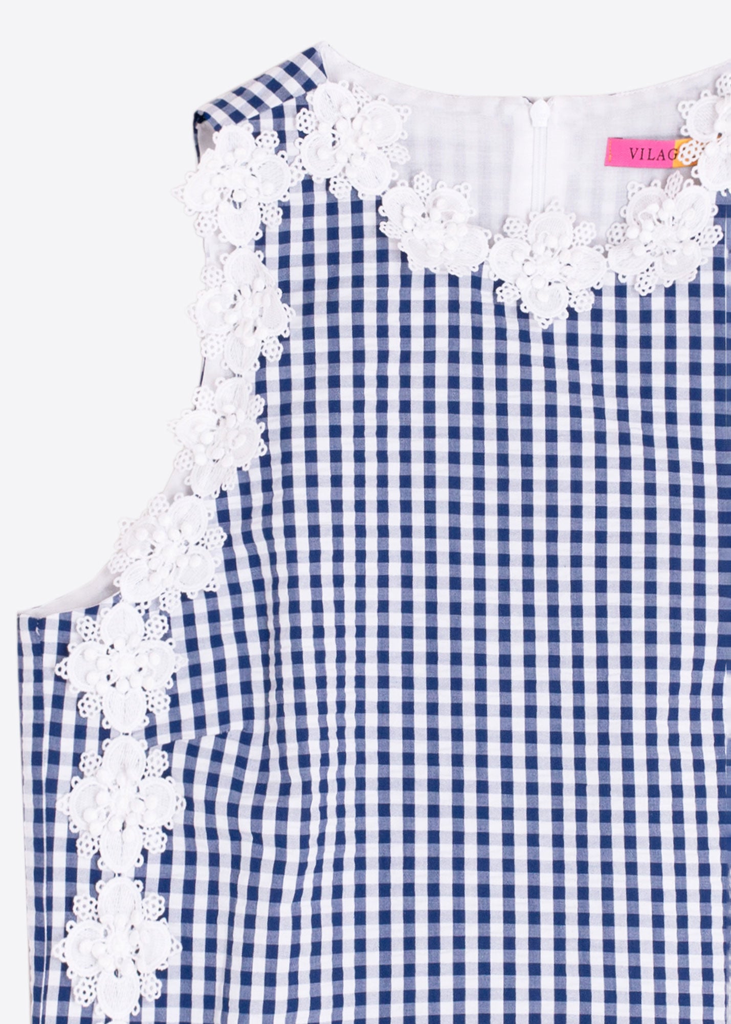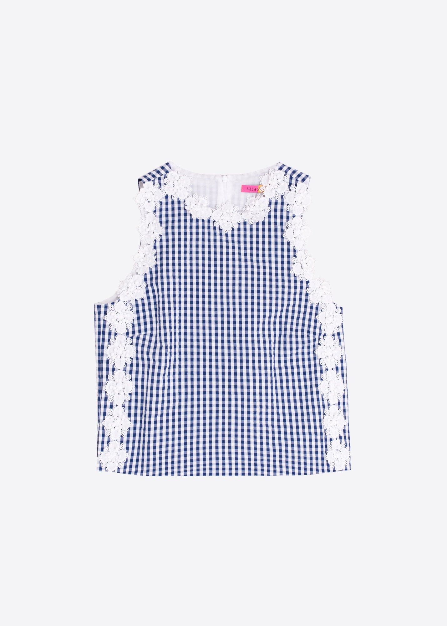 VILAGALLO Blue Gingham Top with Floral Appliques