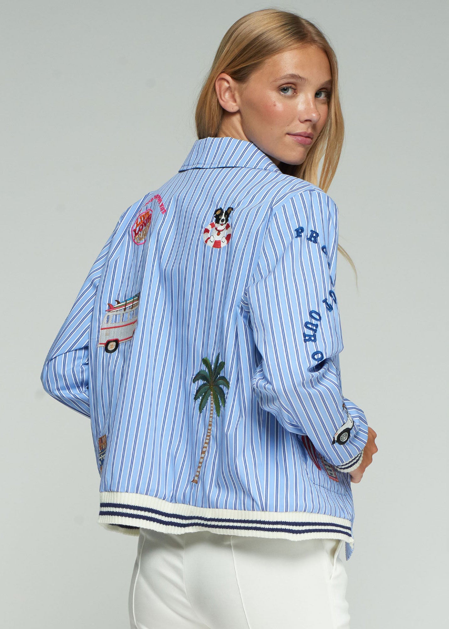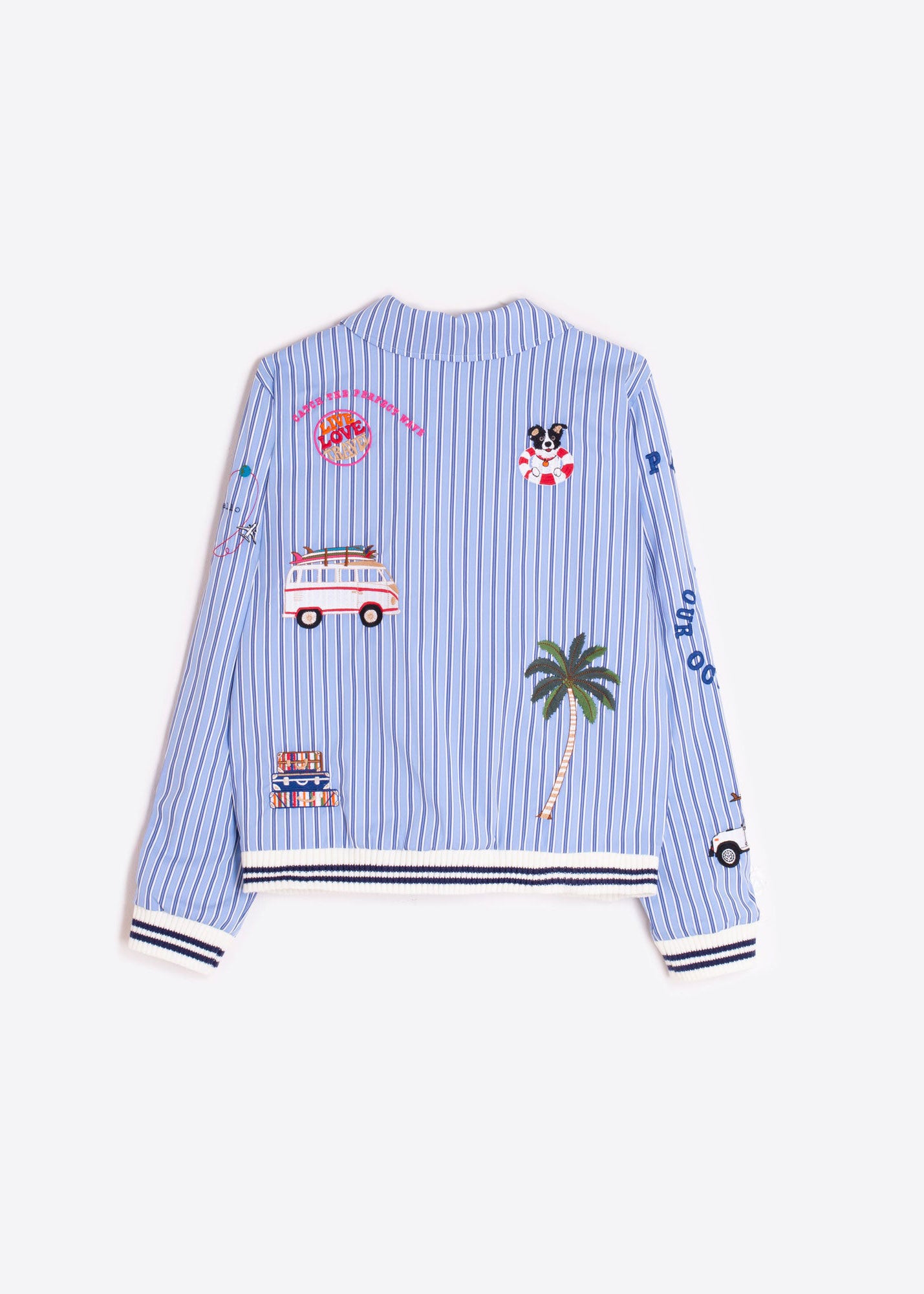 Blue jacket with thin vertical stripes and a front zip closure. Surf embroidery on the front, back, and sleeves. Shirt collar, cuffs, and hem with contrasting ribbed trim.