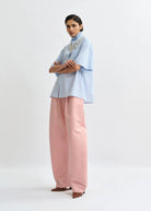 100% cotton oversized shirt with a relaxed fit. It features a classic collar, button fastening, and dropped shoulders. Designed with 3/4 sleeves, a chest pocket with an embroidered "E" detail, and slits in the side seams for ease of movement. A separate triangle scarf with embellishment along the bottom edge adds a playful touch.