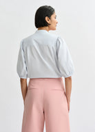 Shirt is designed for a slightly structured fit and features a button-front closure and an elegant mandarin collar. The distinctive puffed shoulders lead into 3/4-length sleeves finished with elasticated cuffs for a refined touch. Adorned with embroidered appliqué flowers throughout.