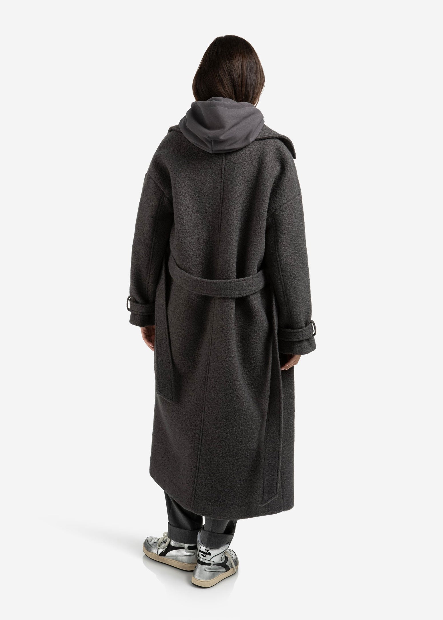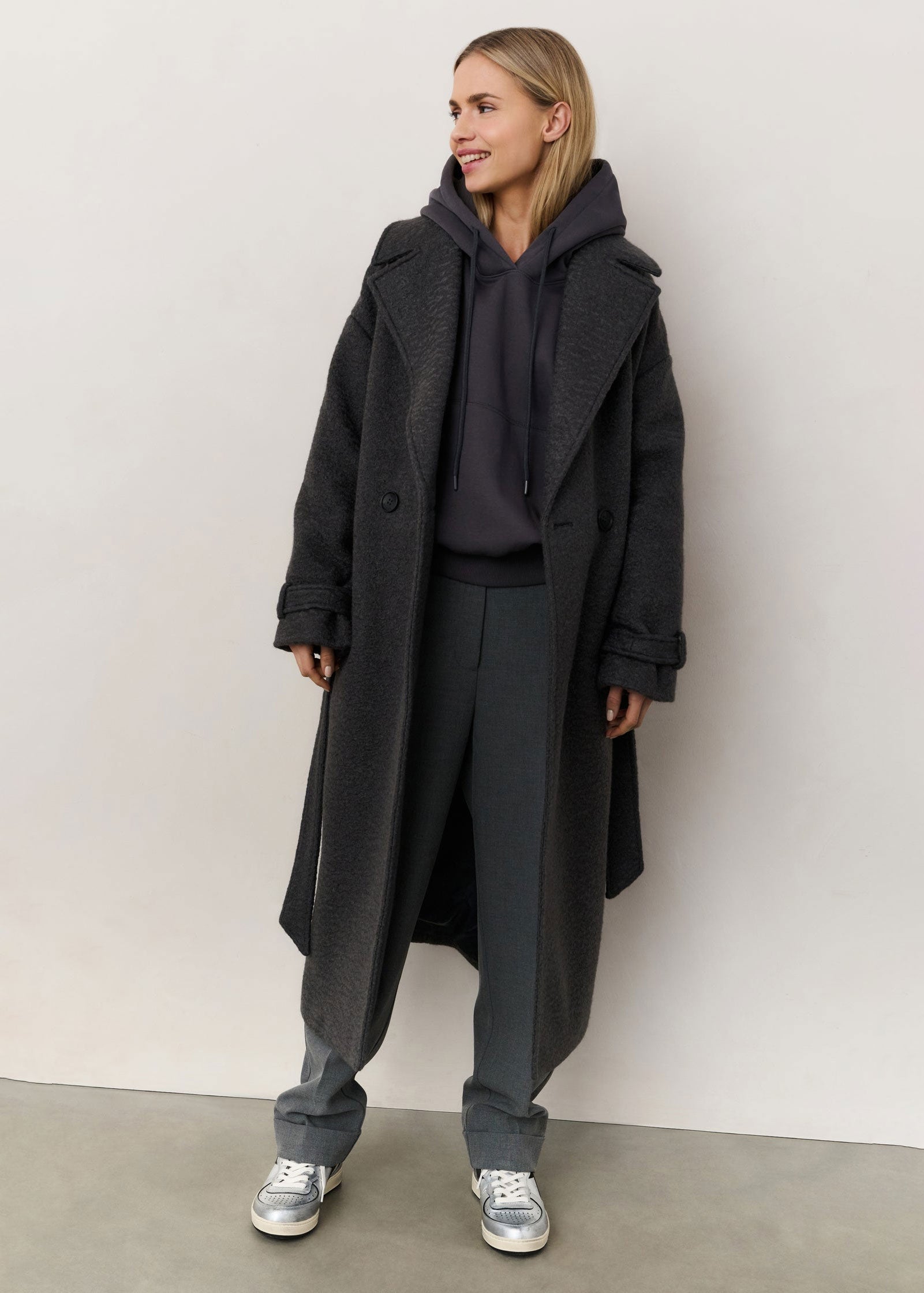 an oversized fit. Designed with a classic lapel collar, double-breasted button closure, and a matching belt to accentuate the waist. Finished with cuff details and front welt pockets, it's perfect for an elegant and comfortable autumn look. The model is 176 cm and wears size 2.
