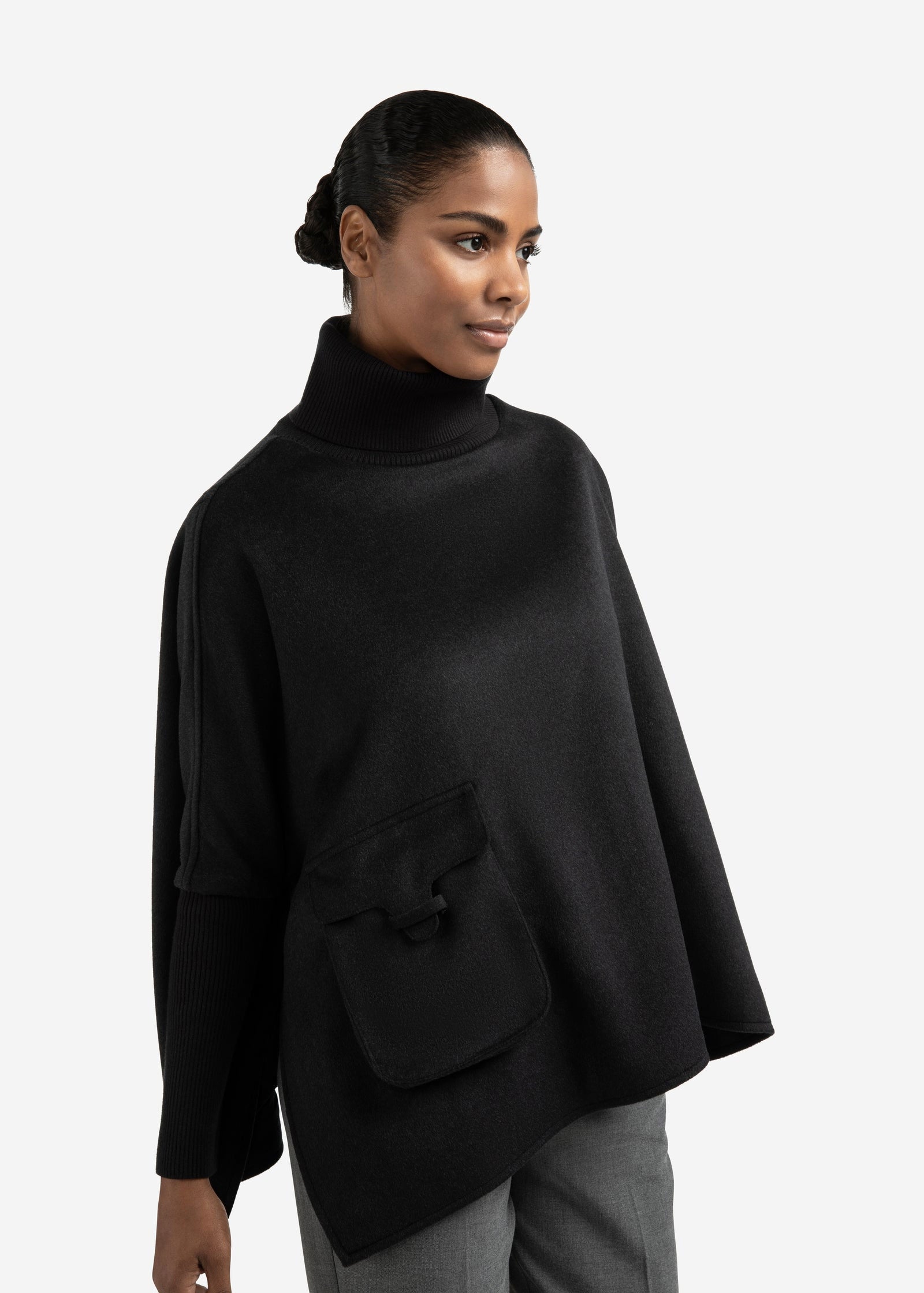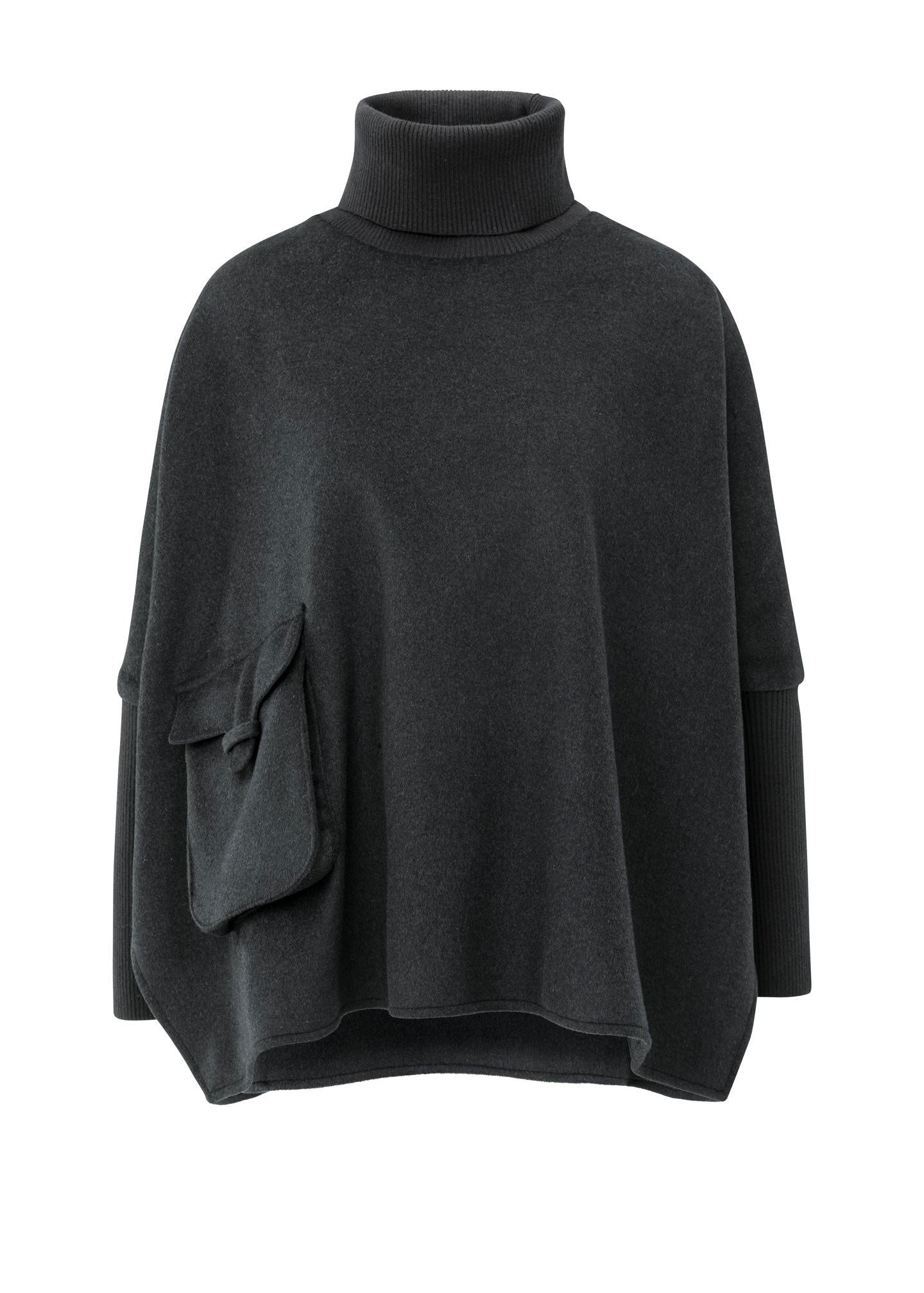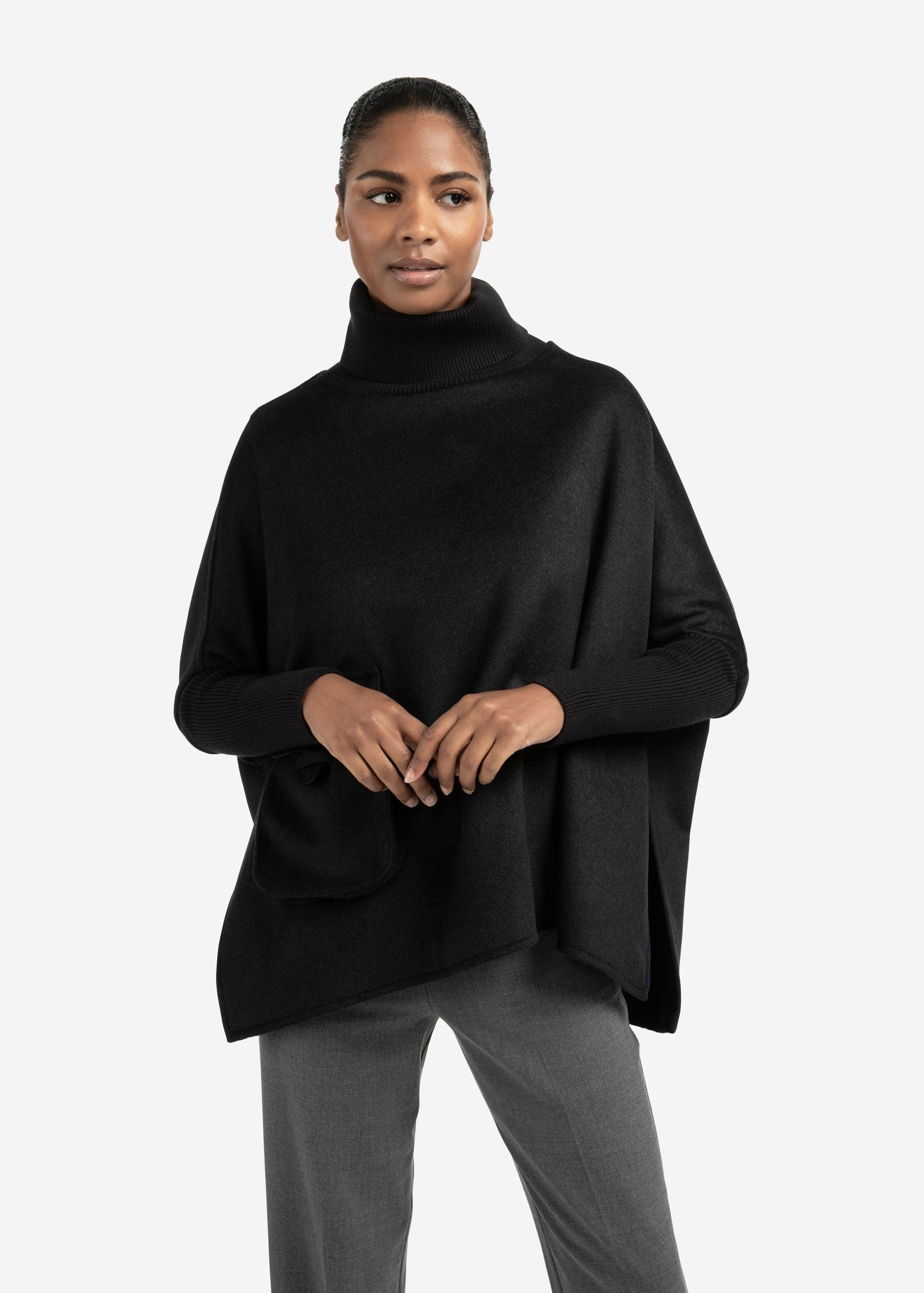 This stylish poncho is made from a soft fabric and designed with a comfortable, relaxed fit. The high turtleneck and ribbed sleeves provide extra warmth, while the large flap pocket adds a contemporary touch. Perfect for layering over a blouse or sweater to create an elegant look on colder days.
