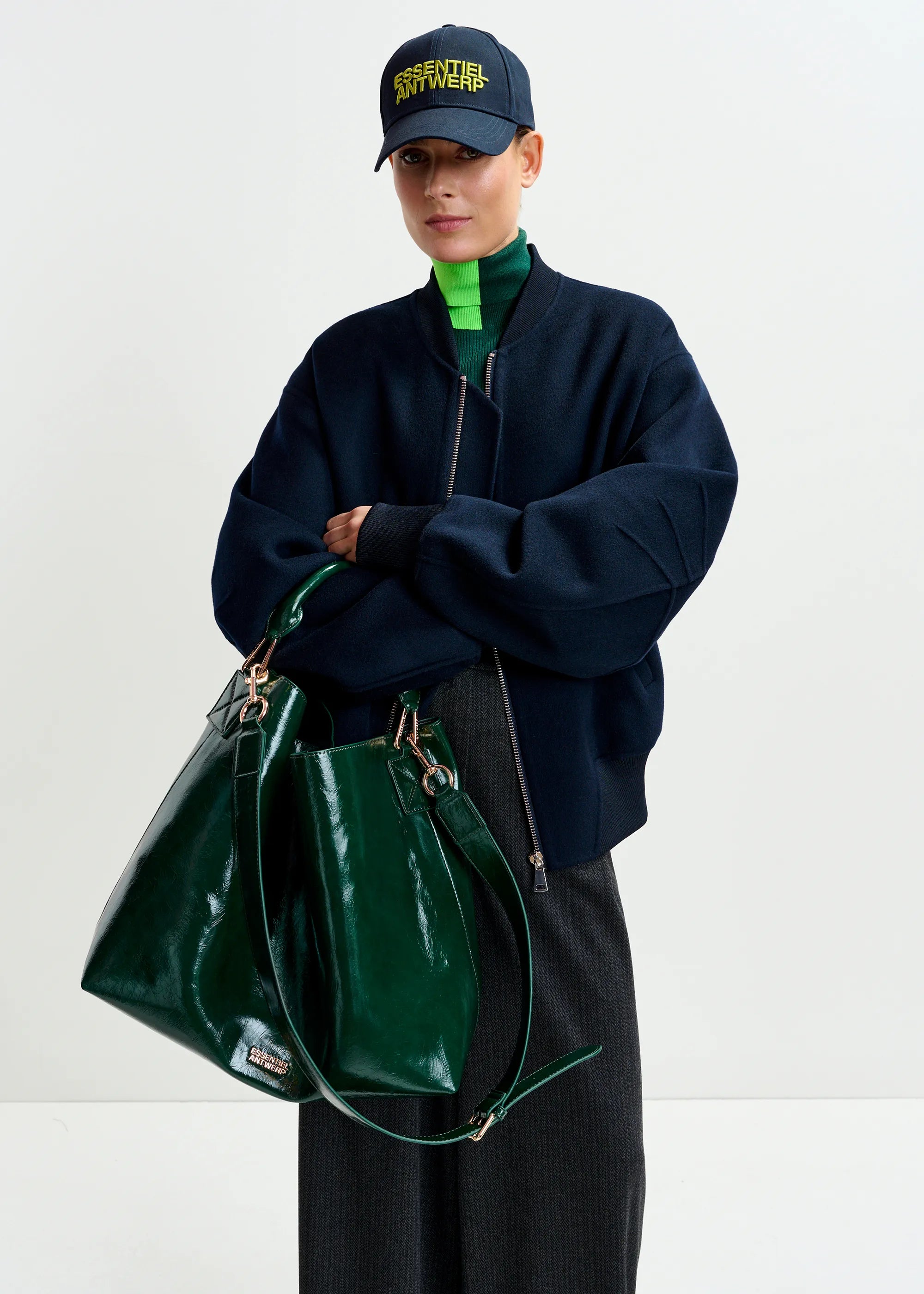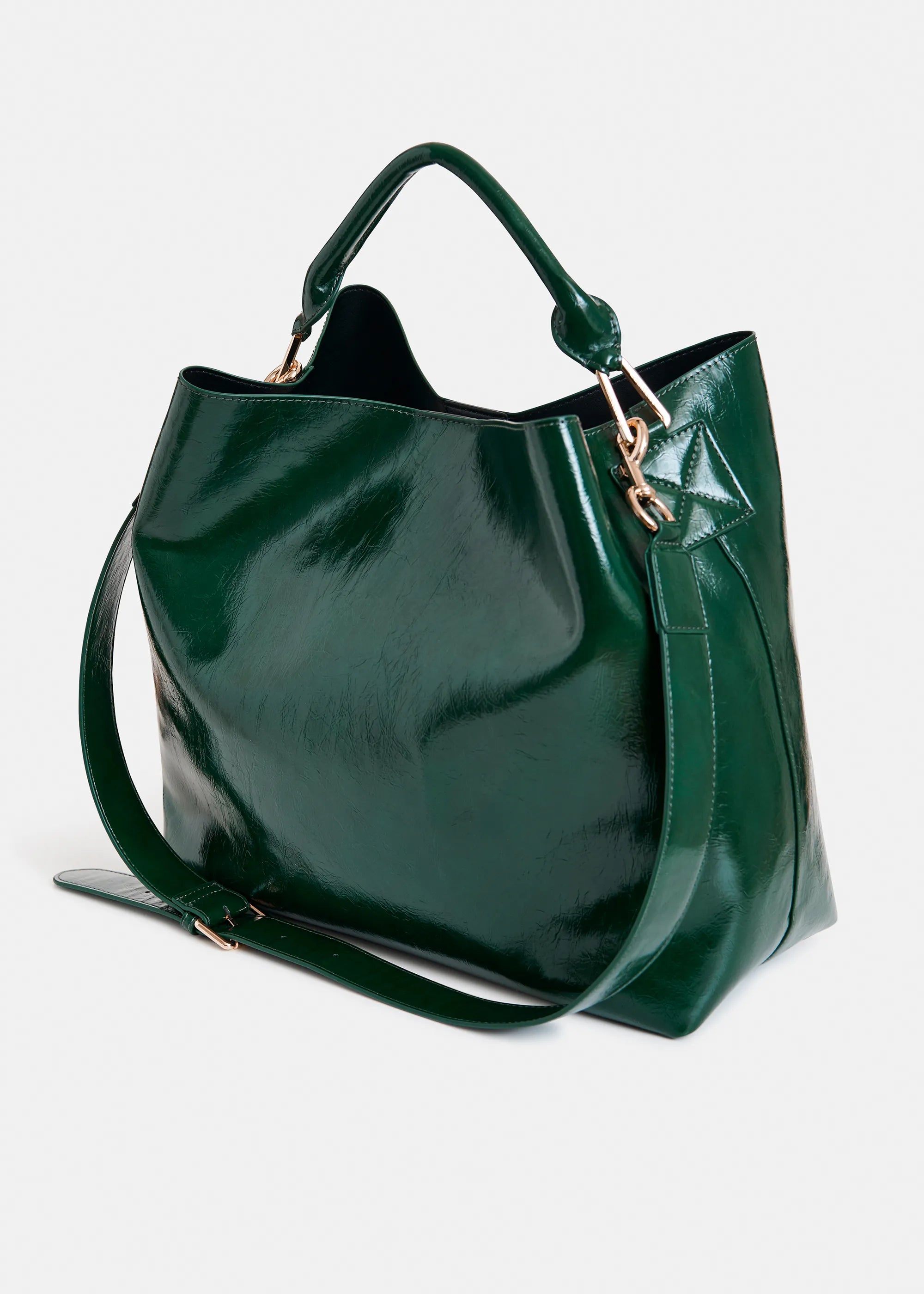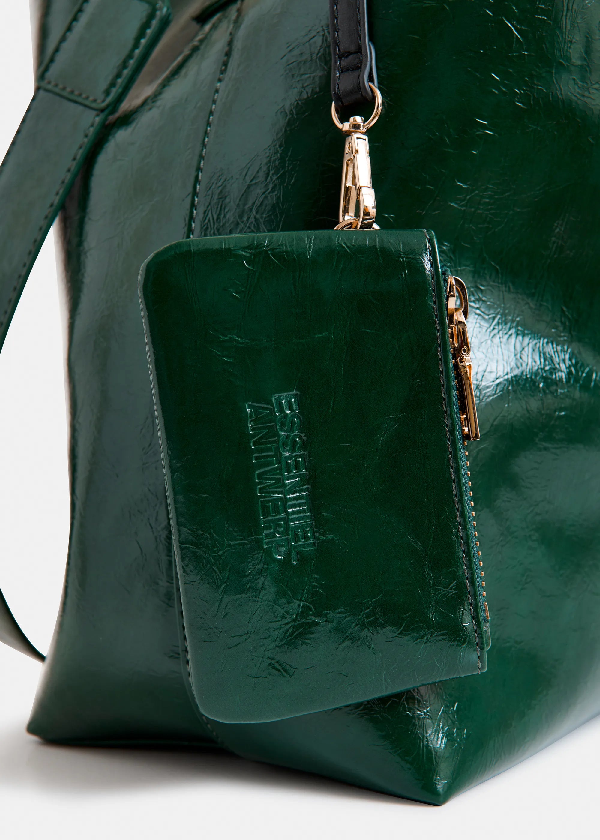 ESSENTIEL ANTWERP Dark green glossy shopper bag with detachable shoulder strap