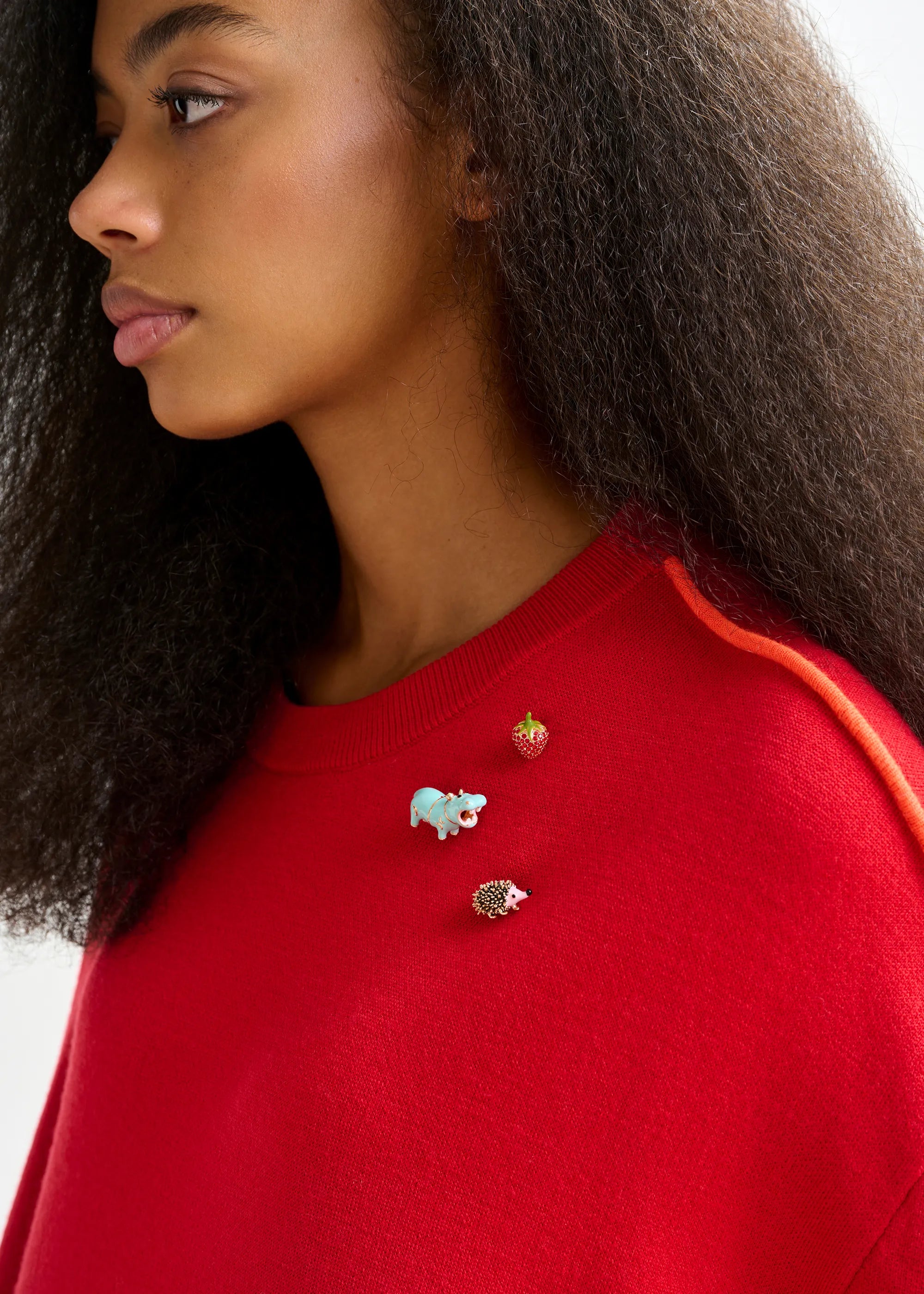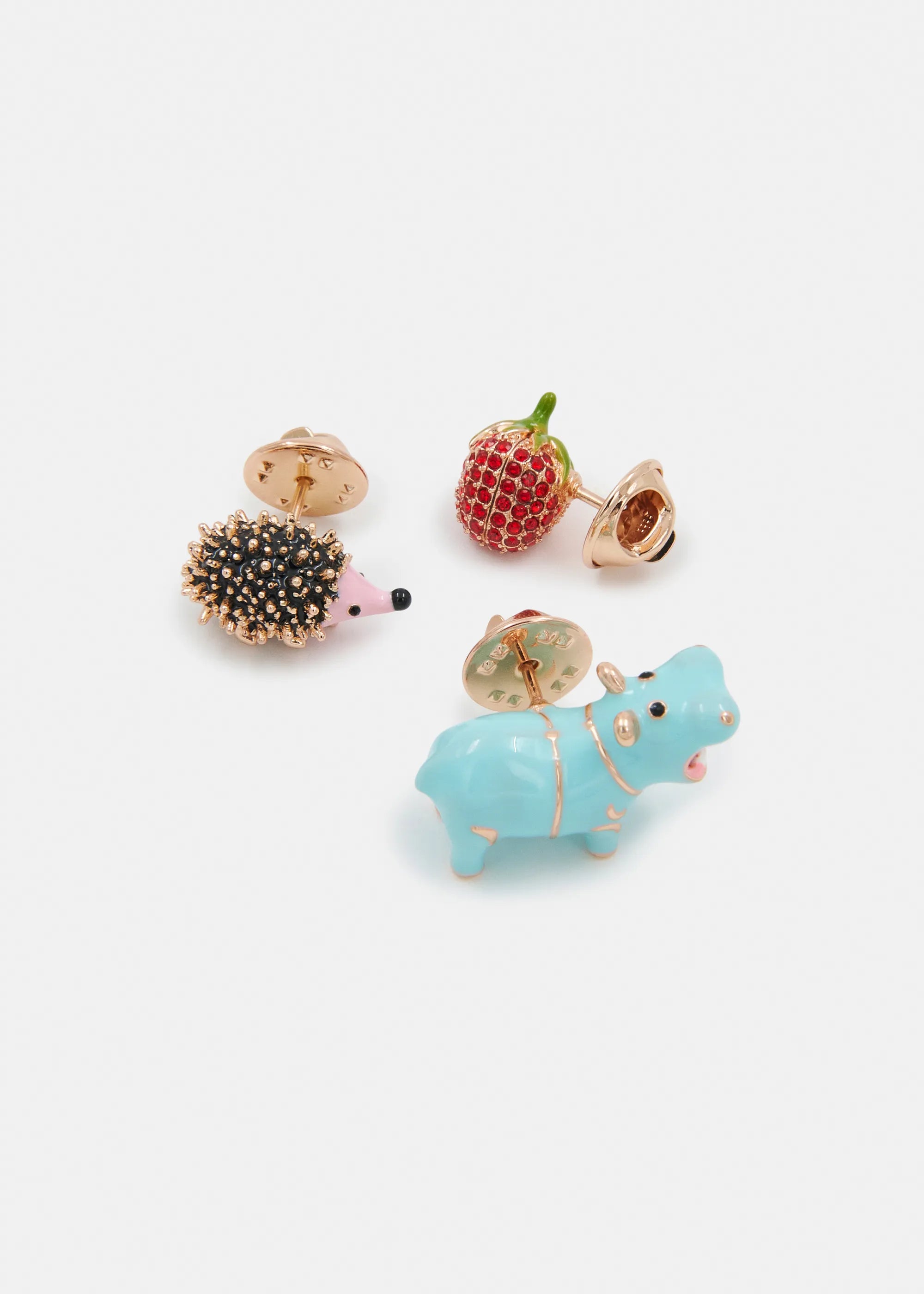 A trio of pins featuring two glossy enamel characters—a hippo and a hedgehog—paired with a rhinestone-encrusted strawberry, each pin brings its own personality and texture. Style them on your denim jacket, tote, or cap to inject a playful twist to any look.