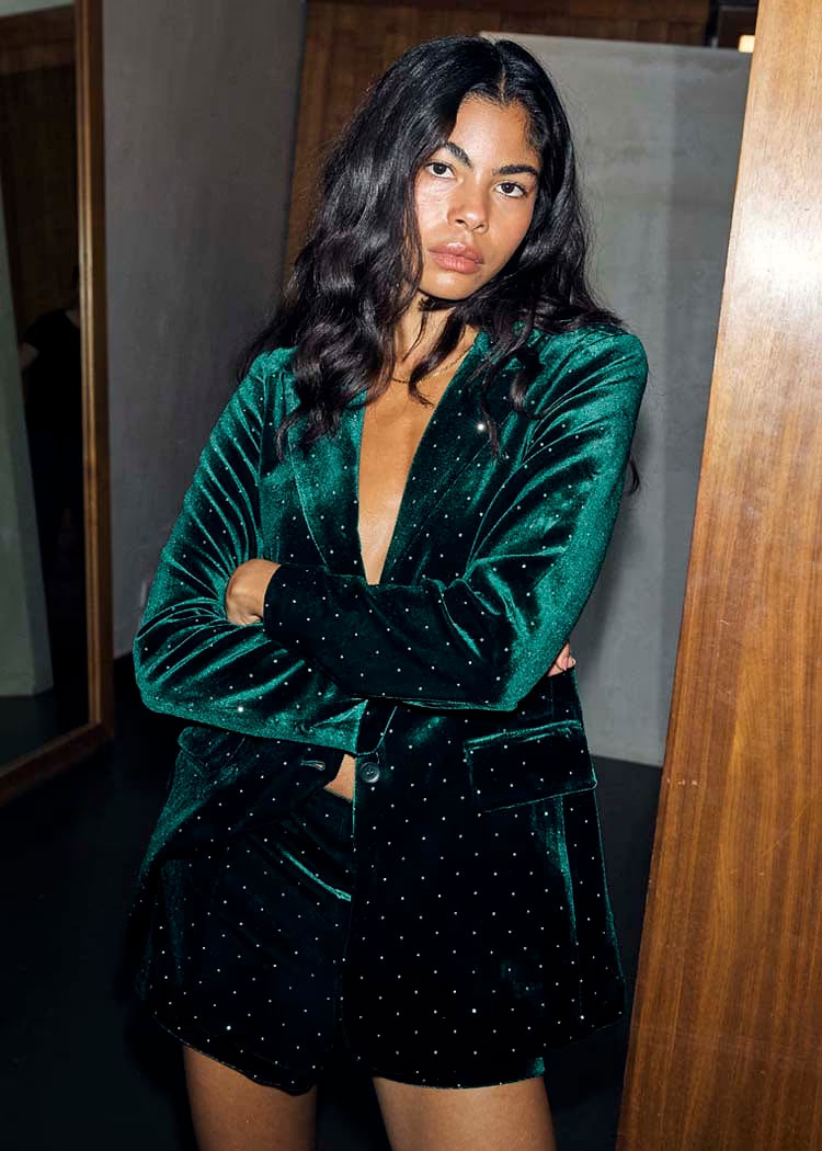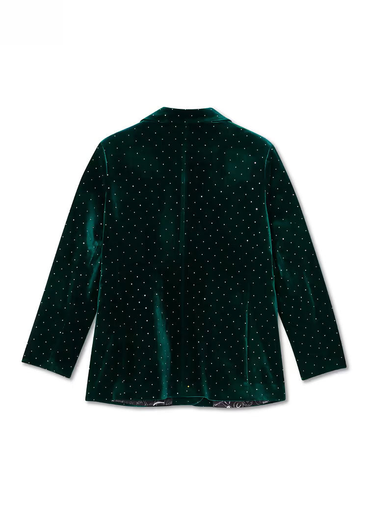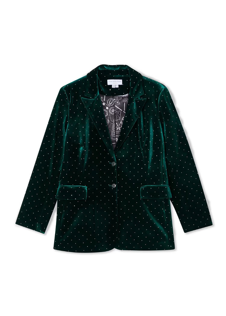 A single breasted blazer made from a buttery soft emerald velvet and studded with little diamonds. The silhouette is designed for a relaxed fit with large side pockets. Style yours with leather trousers and loafers for the office or the matching arden trousers and heels for after work drinks.