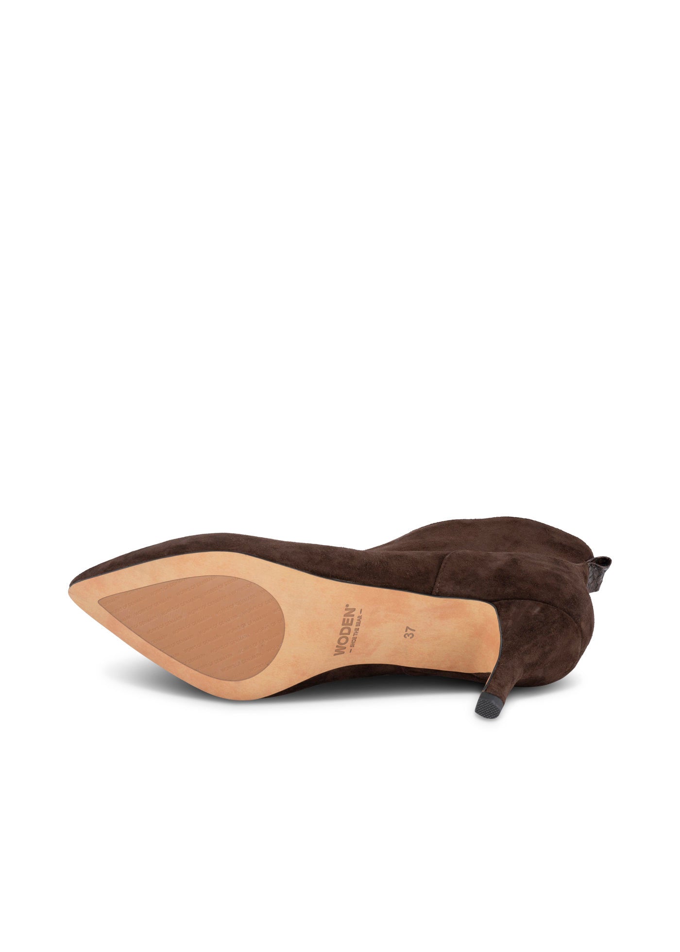 Valentine. Made from 100% certified LWG suede, this low-cut ankle bootie features a pointed toe and a structured, feminine silhouette. It includes an upcycled fish leather detail with ASC certification and WODEN’s Natural Soft Technology™ for added comfort and support. Suitable for day or evening wear.