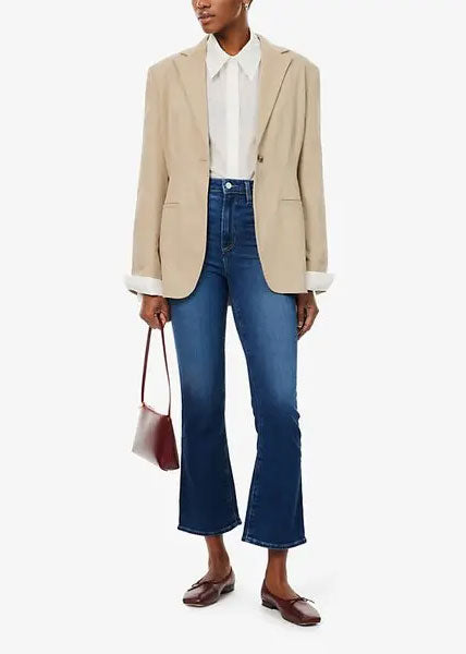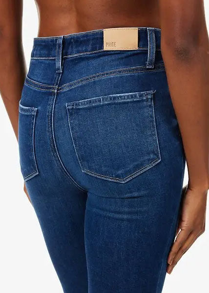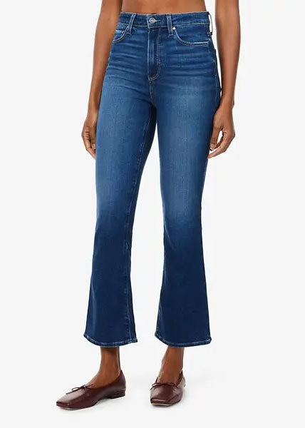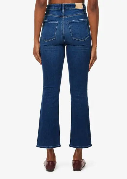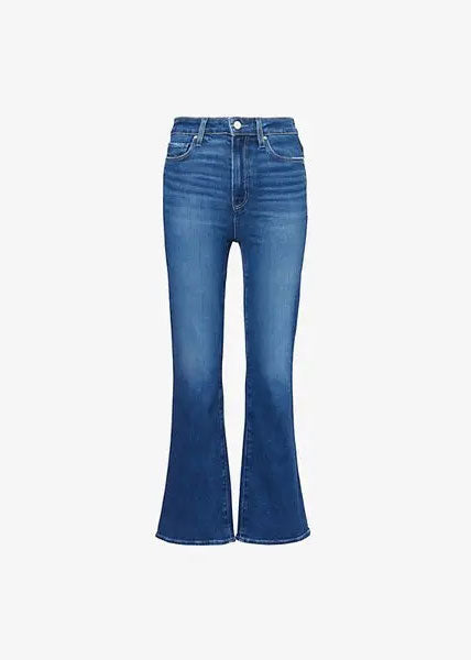 These PAIGE stretch-denim jeans are crafted from 92% cotton, 6% polyester, and 2% elastane. The jeans feature a button and zip-fly fastening, slim fit, high rise, flared leg, cropped length, structured waistband, belt loops, classic five pockets, branded hardware, faded wash and whiskering, brand patch at back waistband, and a V-shaped yoke at the back. The jeans have a rise of 10.5in / 27cm, inside leg of 28in / 71cm, and a leg opening of 16in / 41cm. They are midweight with slight stretch.