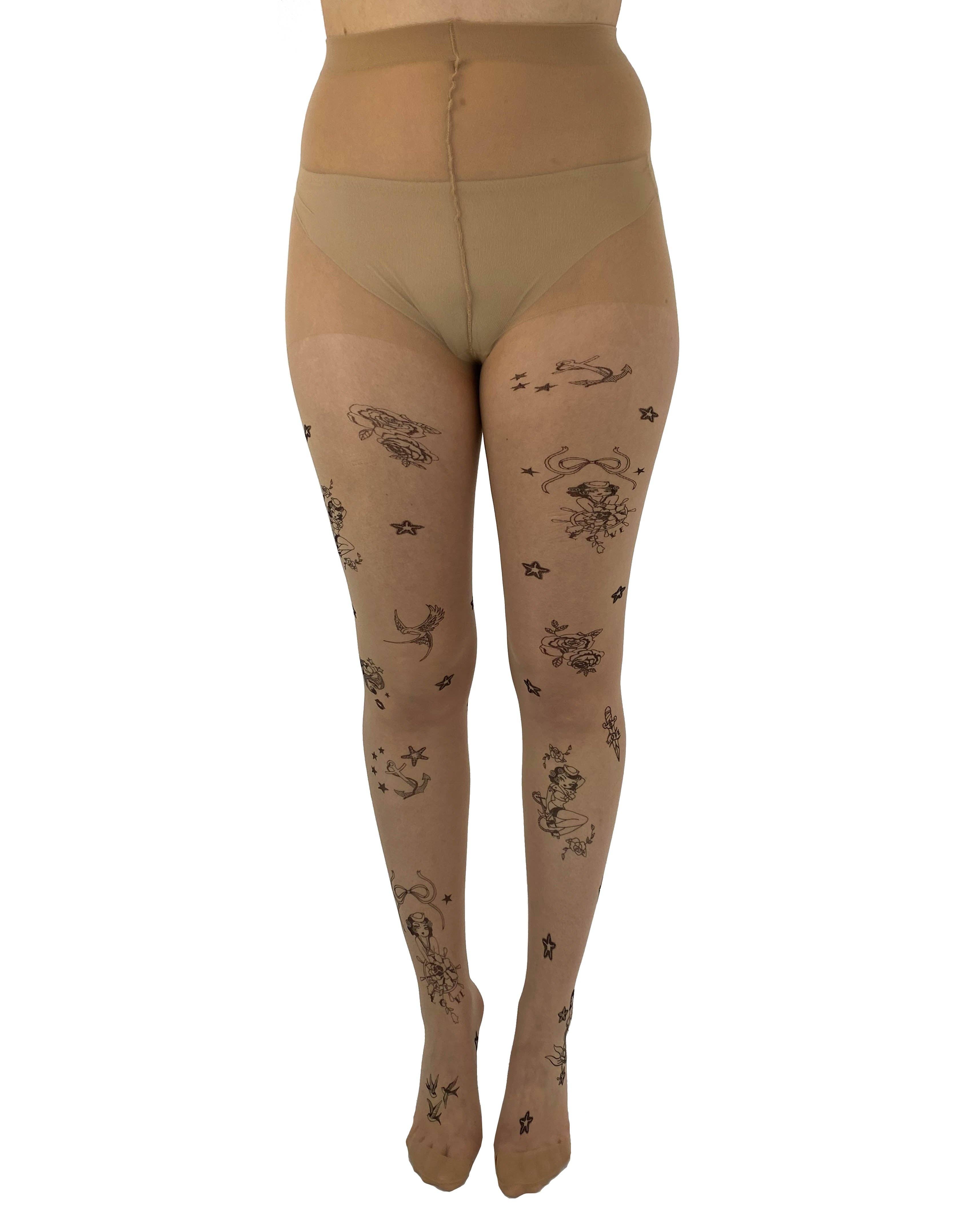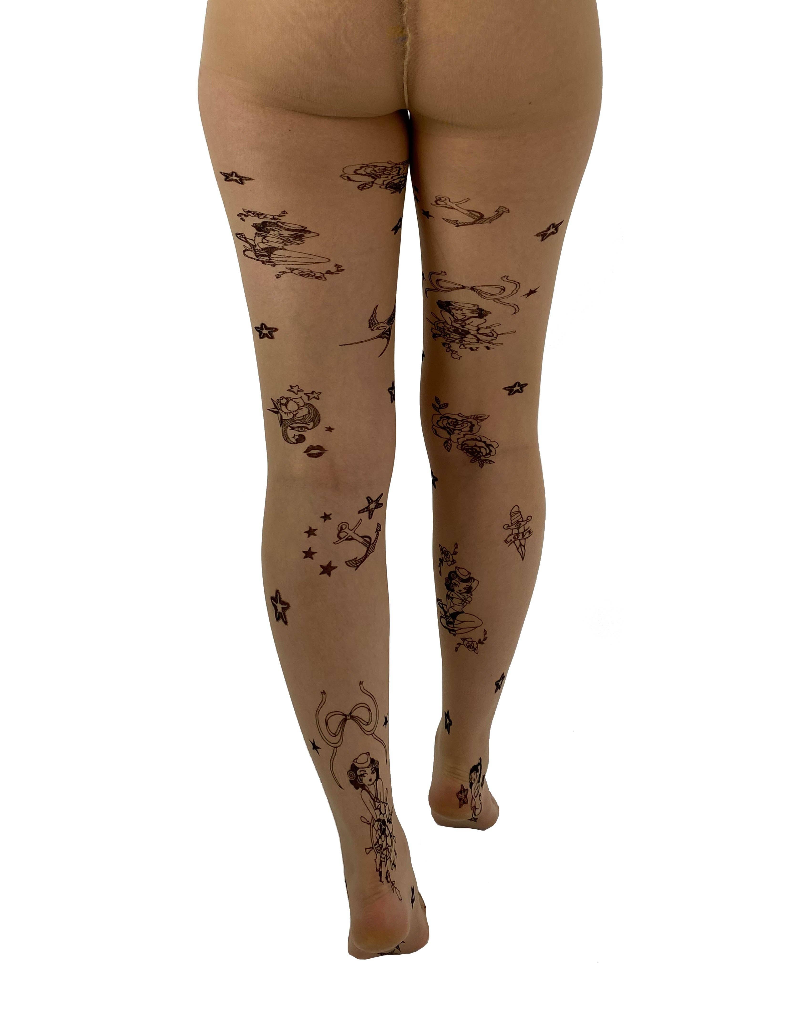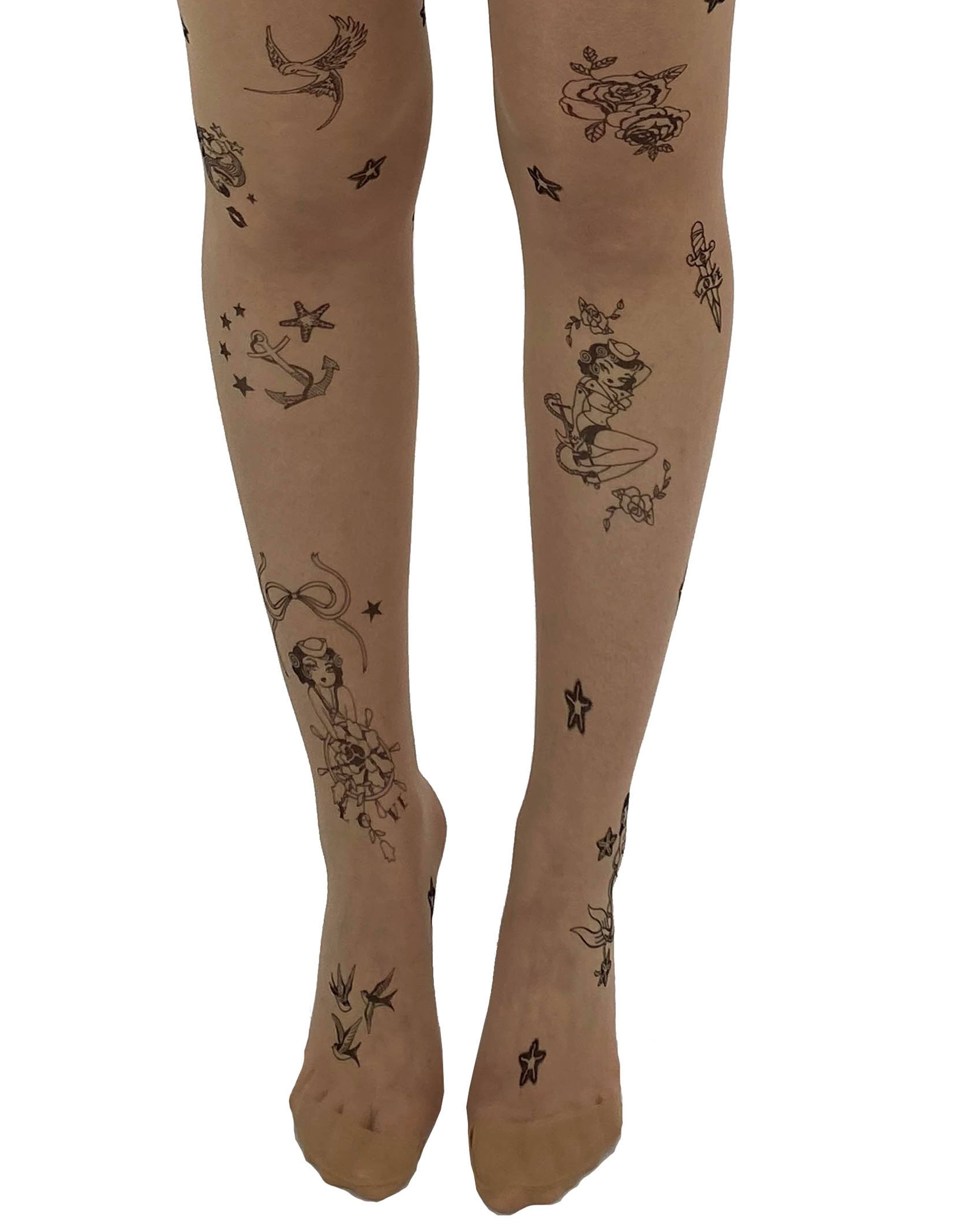 Introducing a brand new design to our tattoo style tights, these are a move on from the popular Tattoo Hearts Tights. High quality 15 denier sheer tights with all over tattoo style print. Inspired by vintage rockabilly trends, these tights are a great festival staple. Composition: 95% Nylon, 5% Elastane
