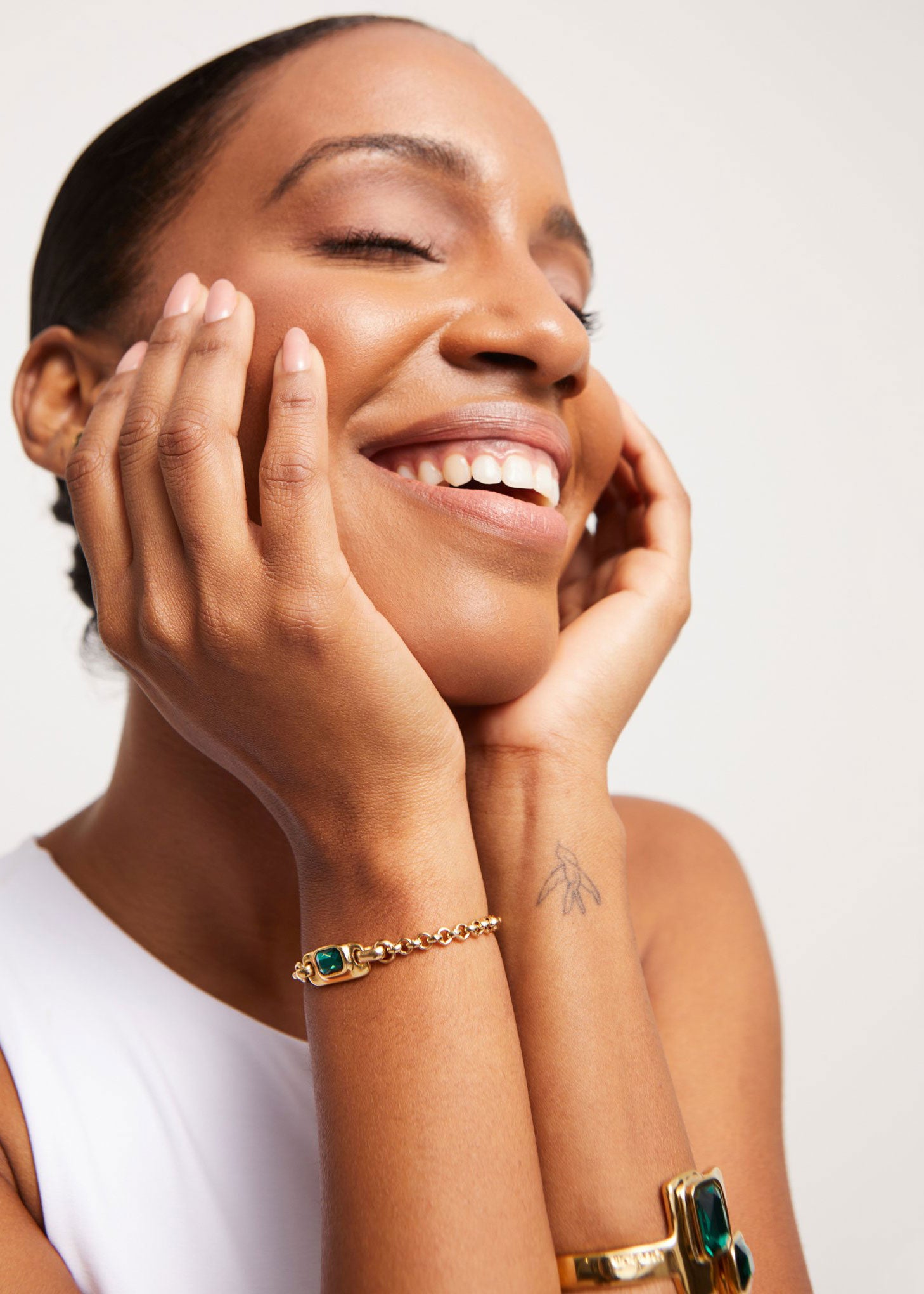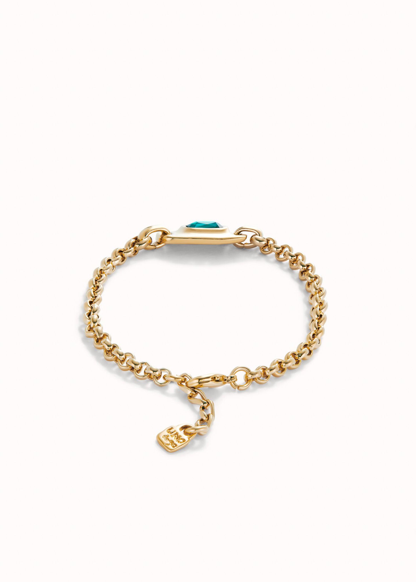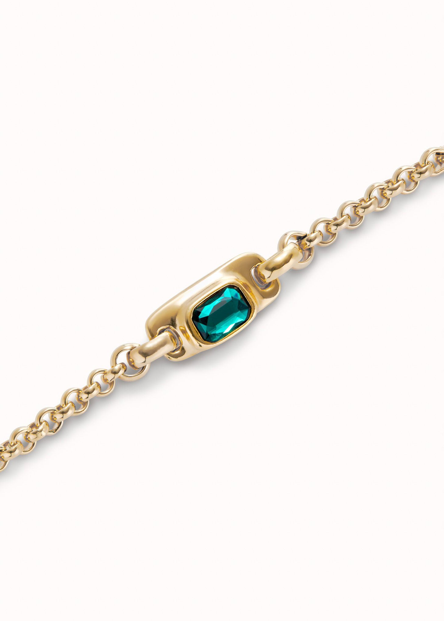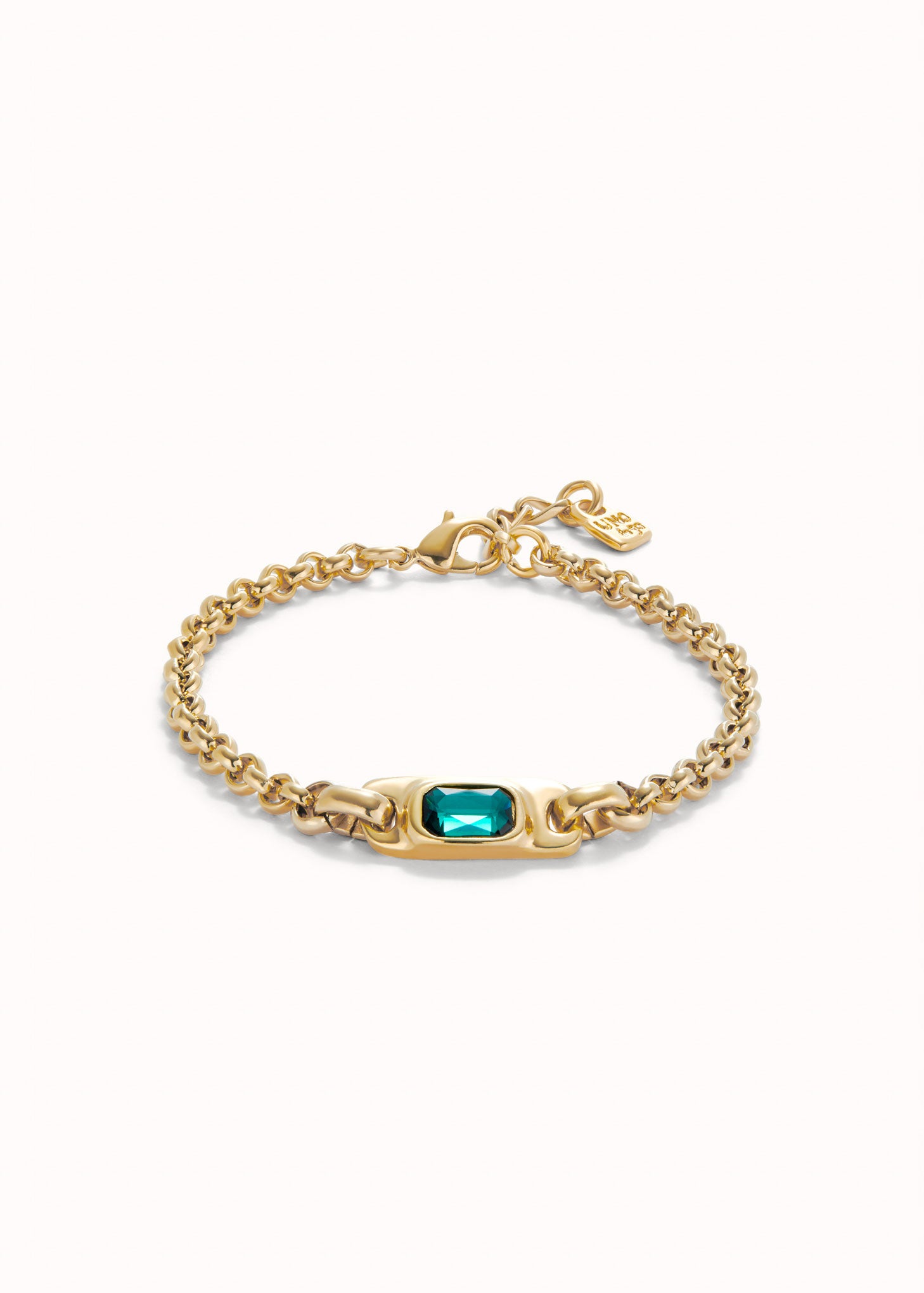 18K gold-plated chain bracelet with central faceted green crystal. Made in Spain with a 100% handmade process. These pieces of jewelry are an art exhibition composed of bracelets, rings, necklaces and earrings, where each piece is a work of art in which we find emerald style cut crystals and pieces with layers of geometric shapes.
