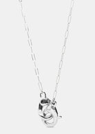 Long necklace of metal alloy plated sterling silver with interlocked carabiner detail.