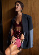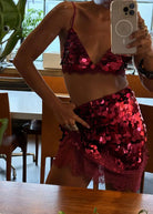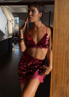 Our best selling maeva skirt silhouette in a stunning deep red colourway. With a lace hem and lathered in sequins adding that sparkle to your everyday outfits! The perfect multi seasonal piece that can be worn though the colder months into the summer heat.