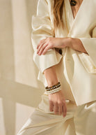 This Spring/Summer, elevate your everyday wrist stack by pairing the chunky Alabama stretch gemstone bracelets with sleek gold chains and classic tennis bracelets. The contrast is key: bold, tactile gemstones bring effortless, sun-washed energy, while polished gold links and rows of sparkling cubic zirconia add a refined, modern edge.