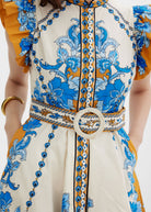A signature piece of the collection, the BARONESSA DRESS is designed in a flattering fit-and-flare silhouette with playful ruffle sleeves and a detachable belt featuring a round fabric-covered buckle. The placement-engineered print — a bold yet elegant floral motif inspired by the flowing lines and ornamental flourishes of the Art Nouveau era — brings the piece to life. Accented with shimmering lurex thread and metallic sequins, it captures a sense of movement and artistry. Contrast-stitched mother-of-pearl buttons add the final touch of craftsmanship.
