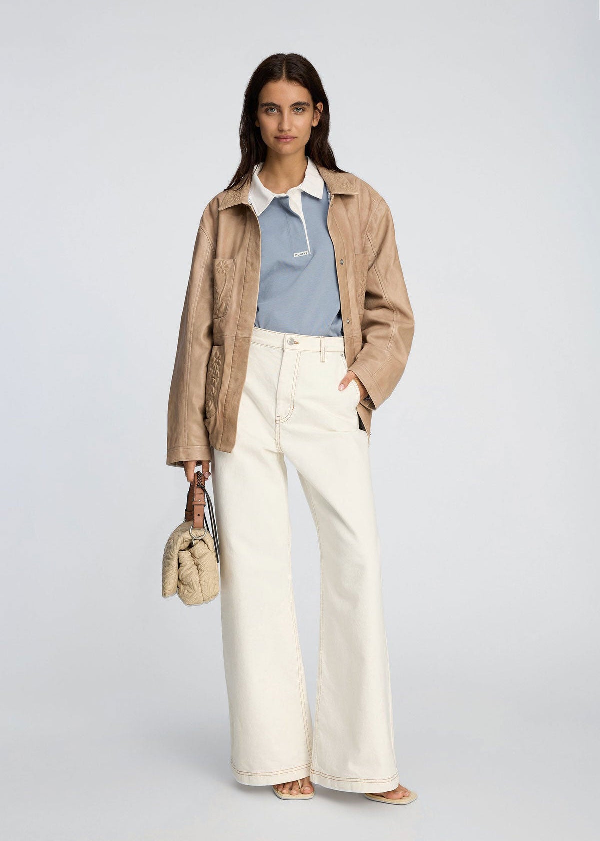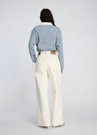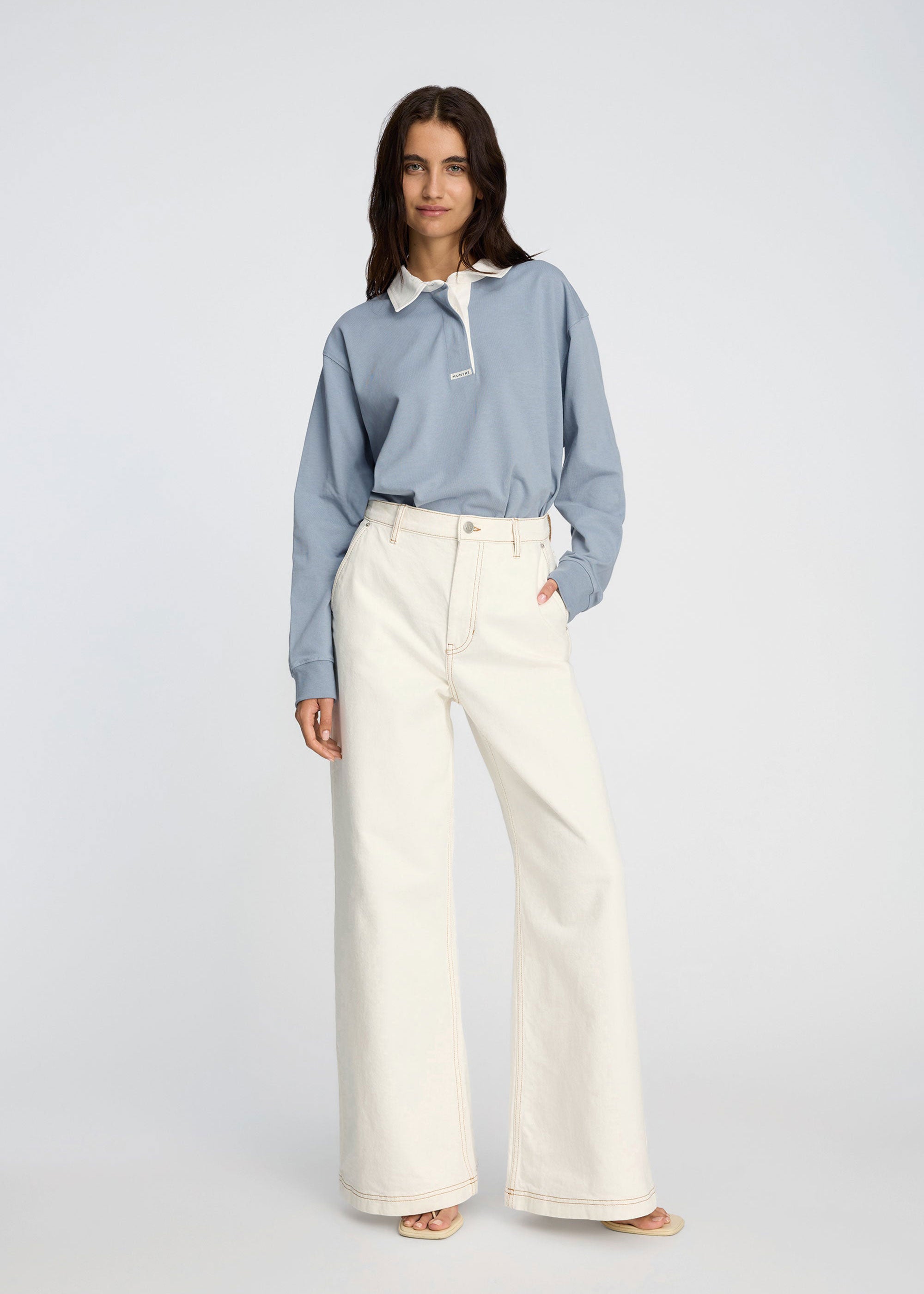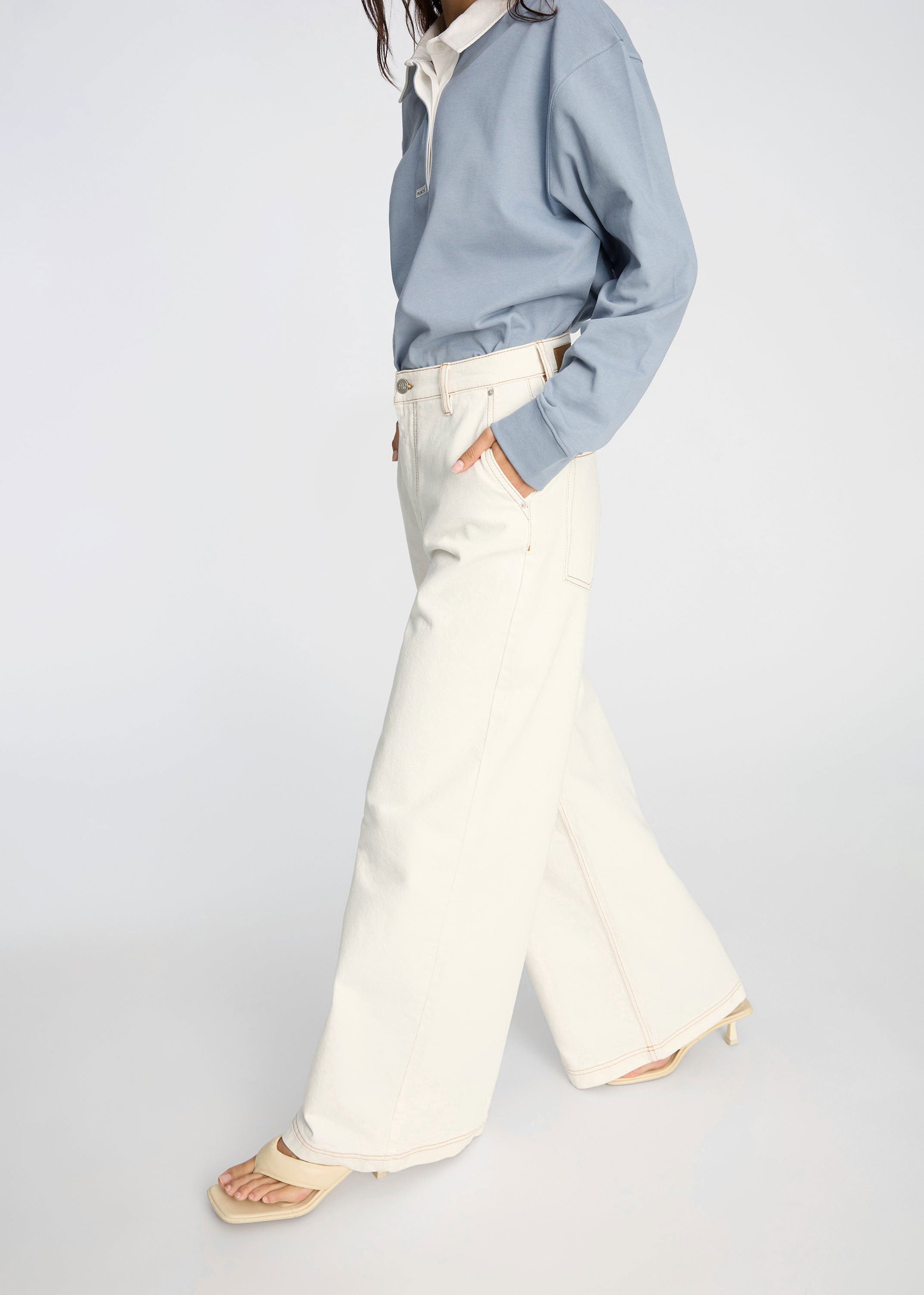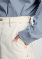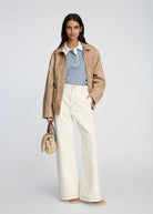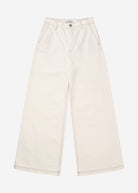 Trousers cut in a wide, straight silhouette, featuring classic details such as slanted pockets, and a zip-and-button closure. The minimal finish and defined topstitching adds a refined look that makes the style easy to wear across seasons.