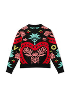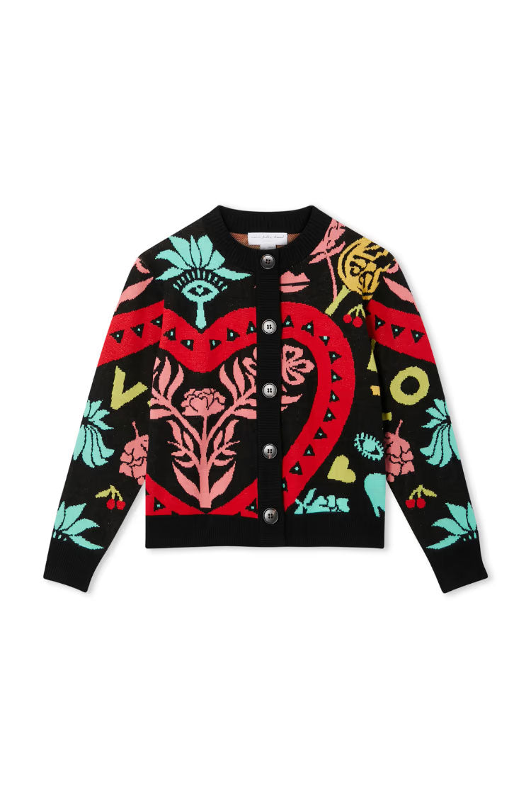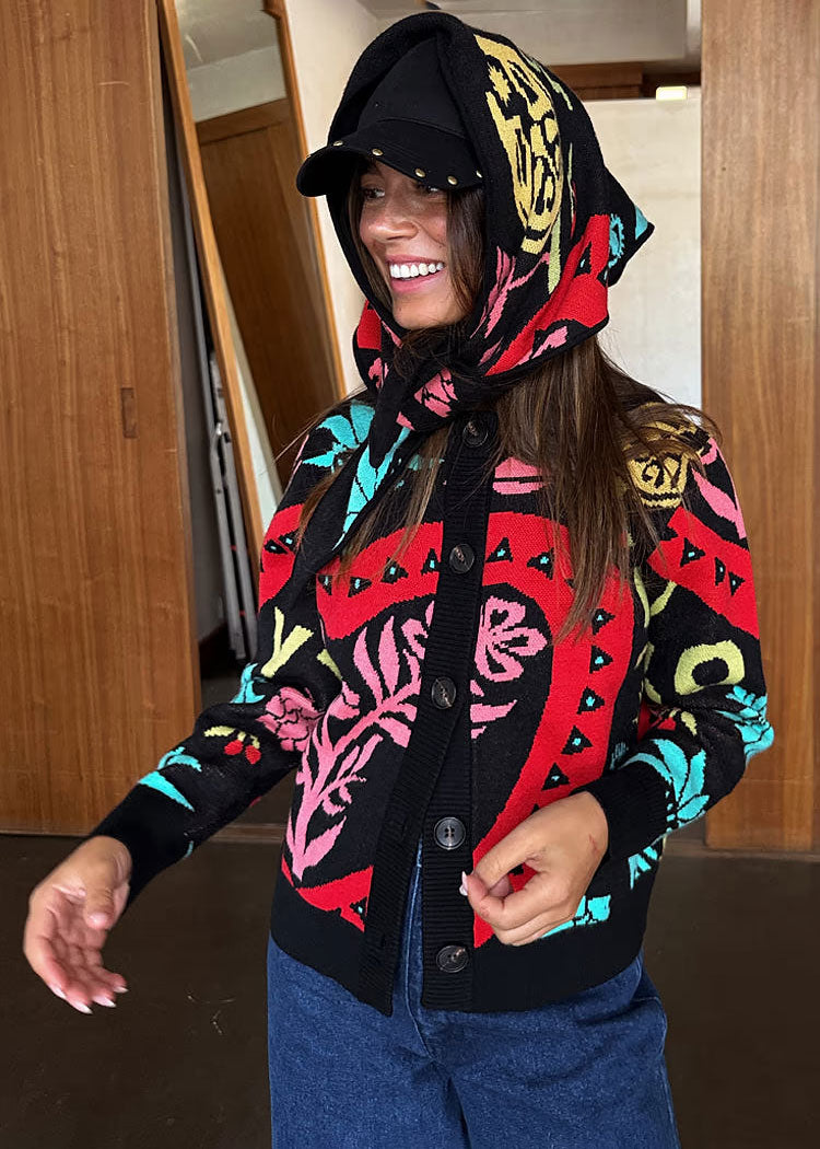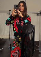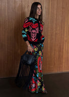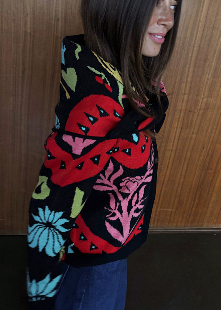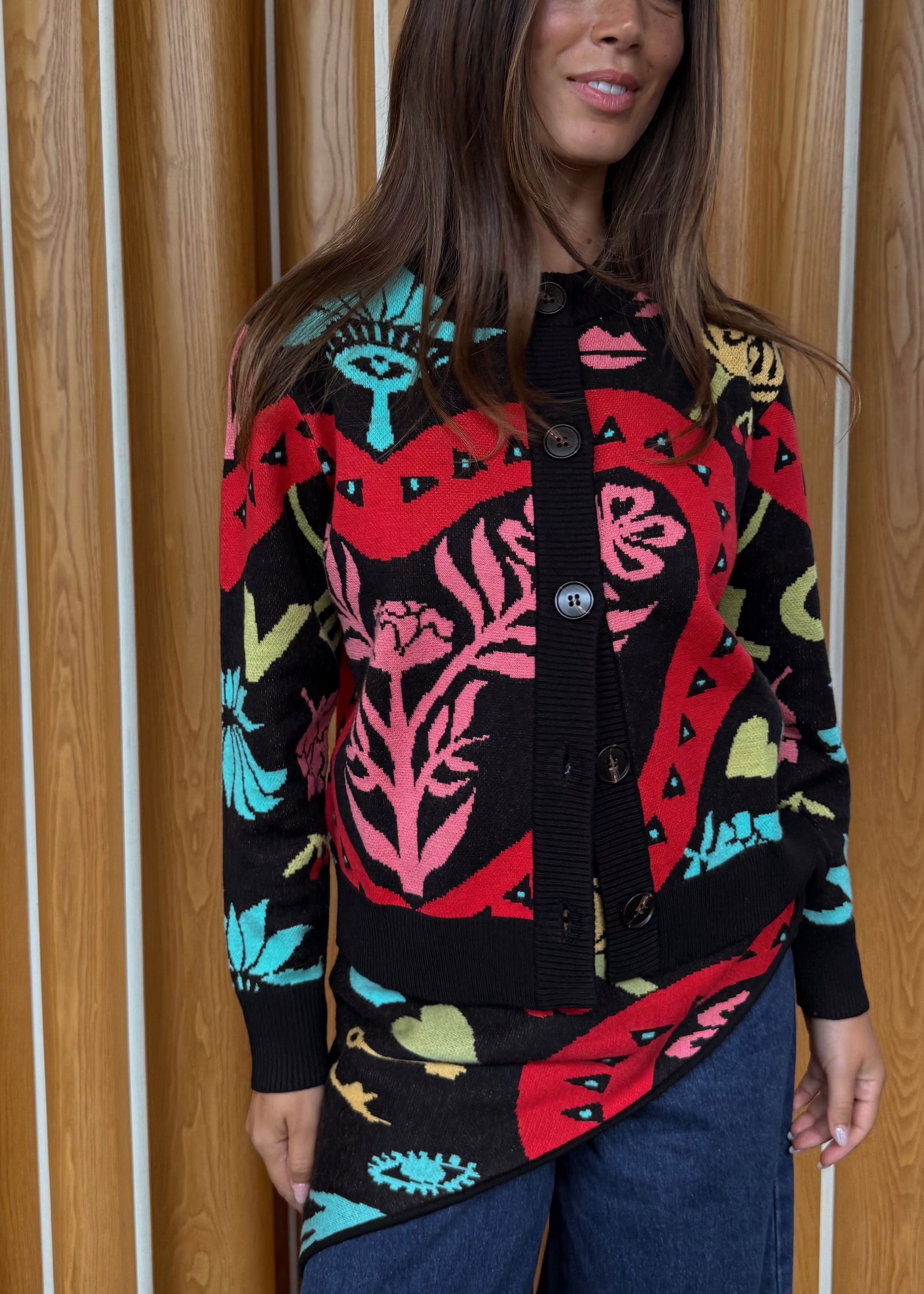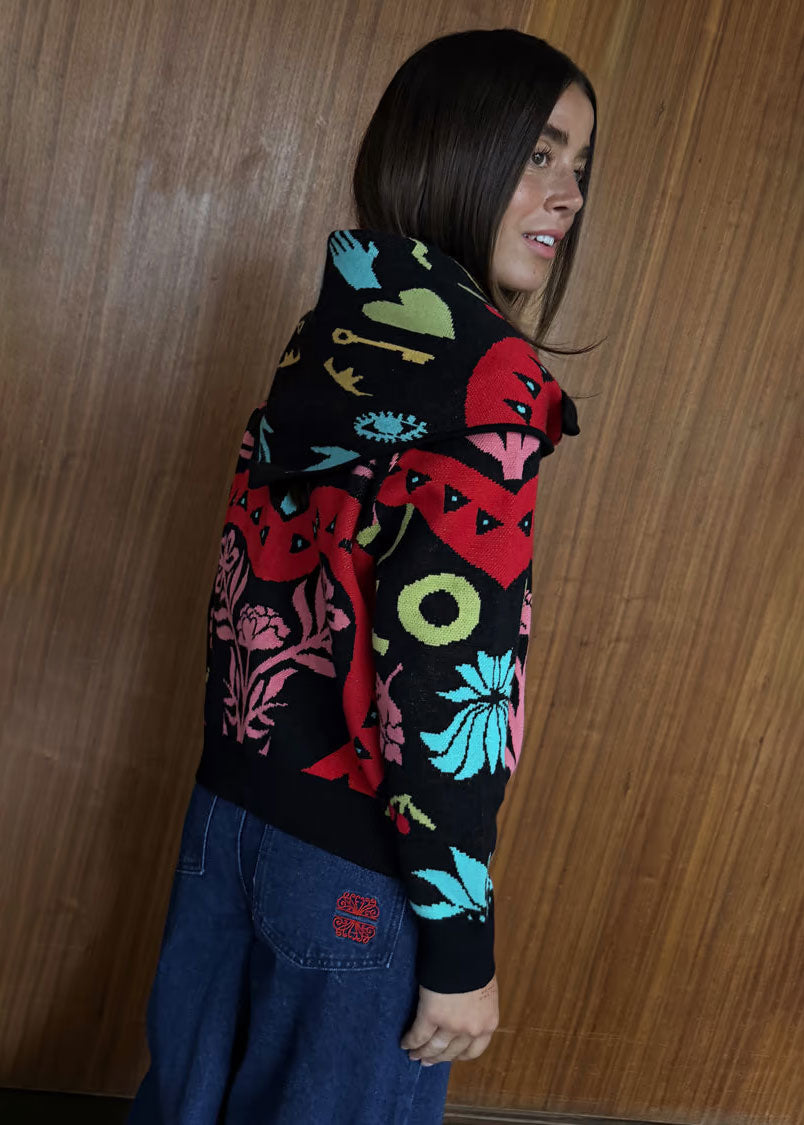 Our best selling knit base in our new Amara print! Ideal for the season, a light throw over for when it gets chilly in the evenings, and feels weighty to drape the frame nicely. Embroidered with our iconic NFD eye and heart motifs and flowers, hand painted by our in-house design team, making it gorgeously head turning.