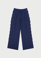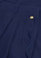 These deep blue trousers feature a subtle wavy pattern along the sides for a playful, elegant touch. Crafted from a soft viscose and linen blend, they offer a breathable, lightweight feel and a relaxed, loose fit. Perfect for casual outings, creative workdays, or effortless everyday style.
