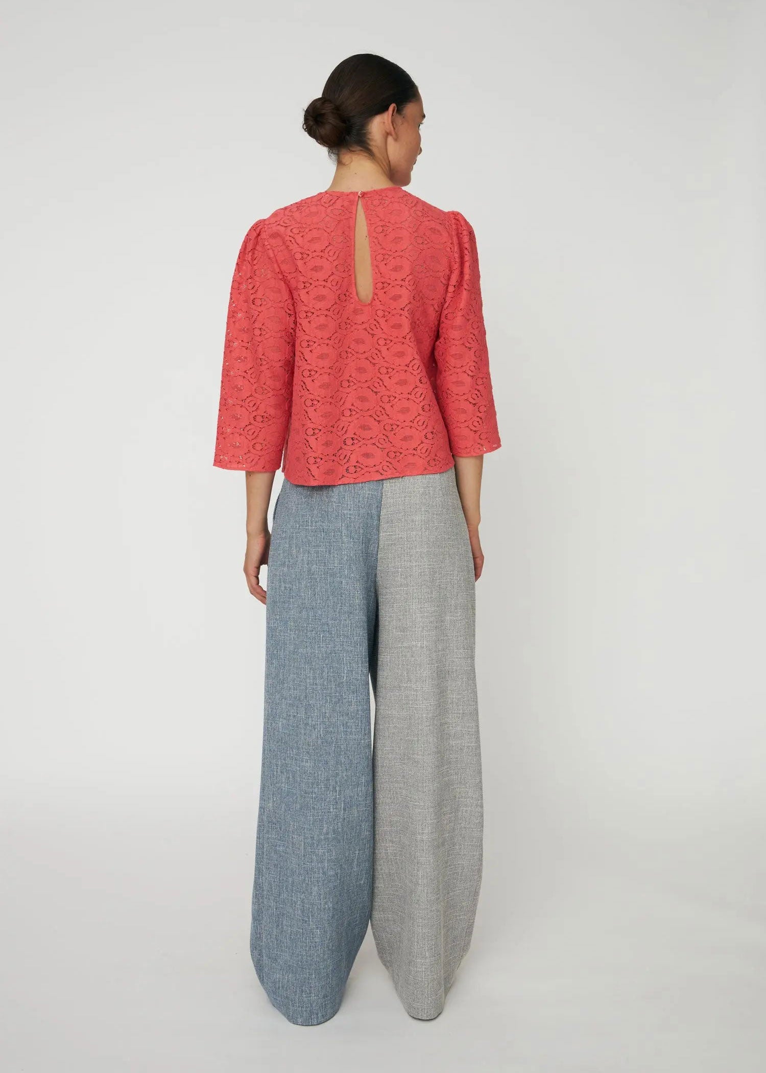 Lightweight blouse made in lace fabric. Designed with a straight fit, a round neckline, and 3/4-length sleeves with subtle volume at the shoulders. Finished with a small opening and button closure at the back.