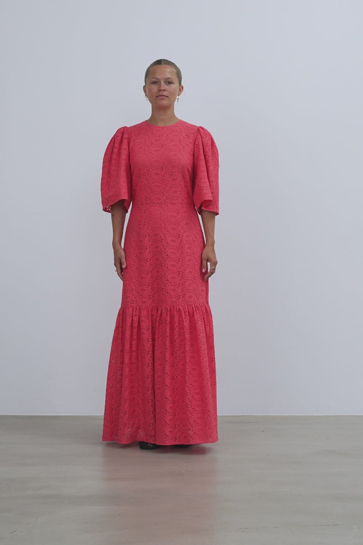 Maxi dress in lace with short puff sleeves and a round neckline. The dress has a defined waist seam and lining. Finished with a small opening and button closure at the back.
