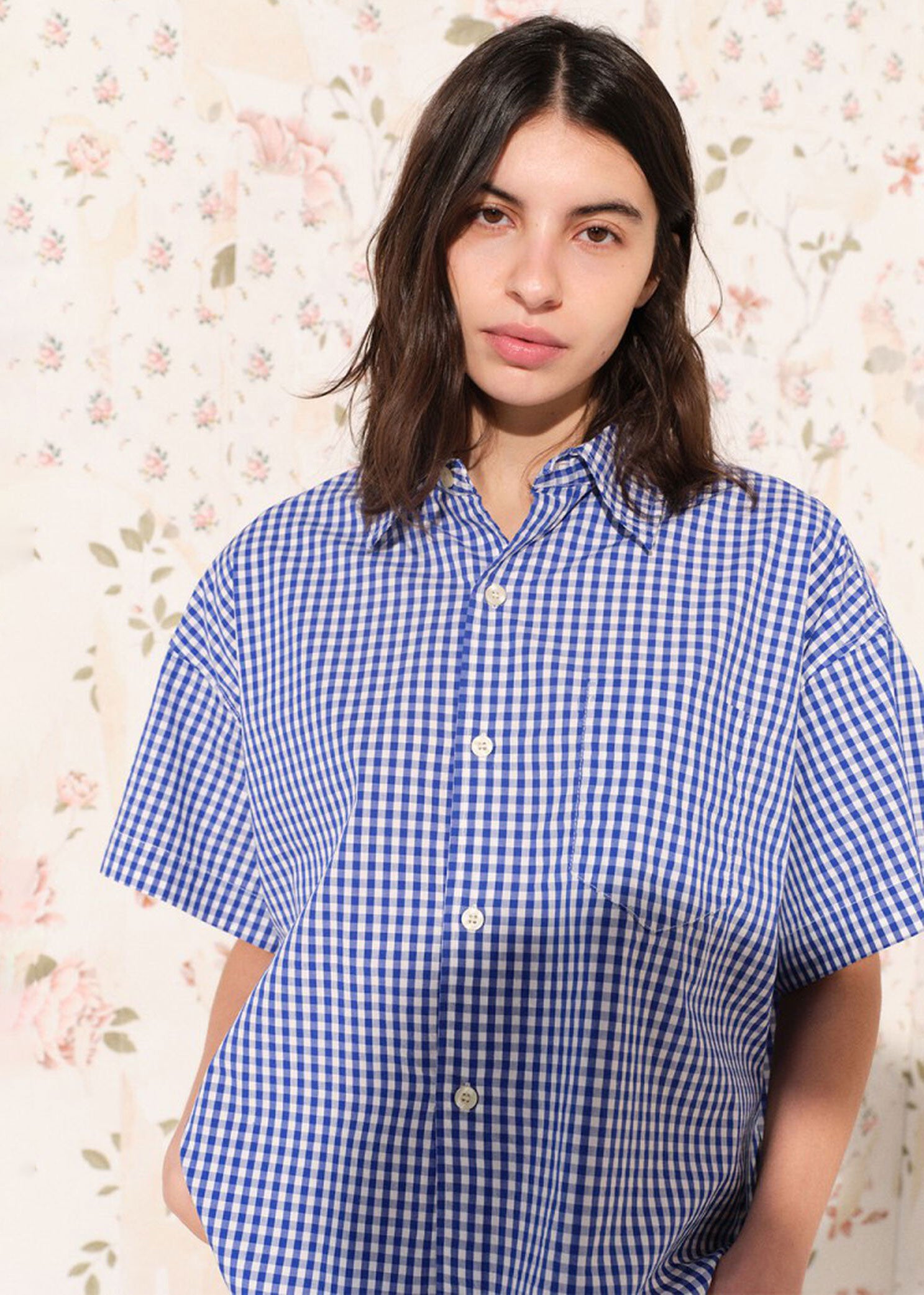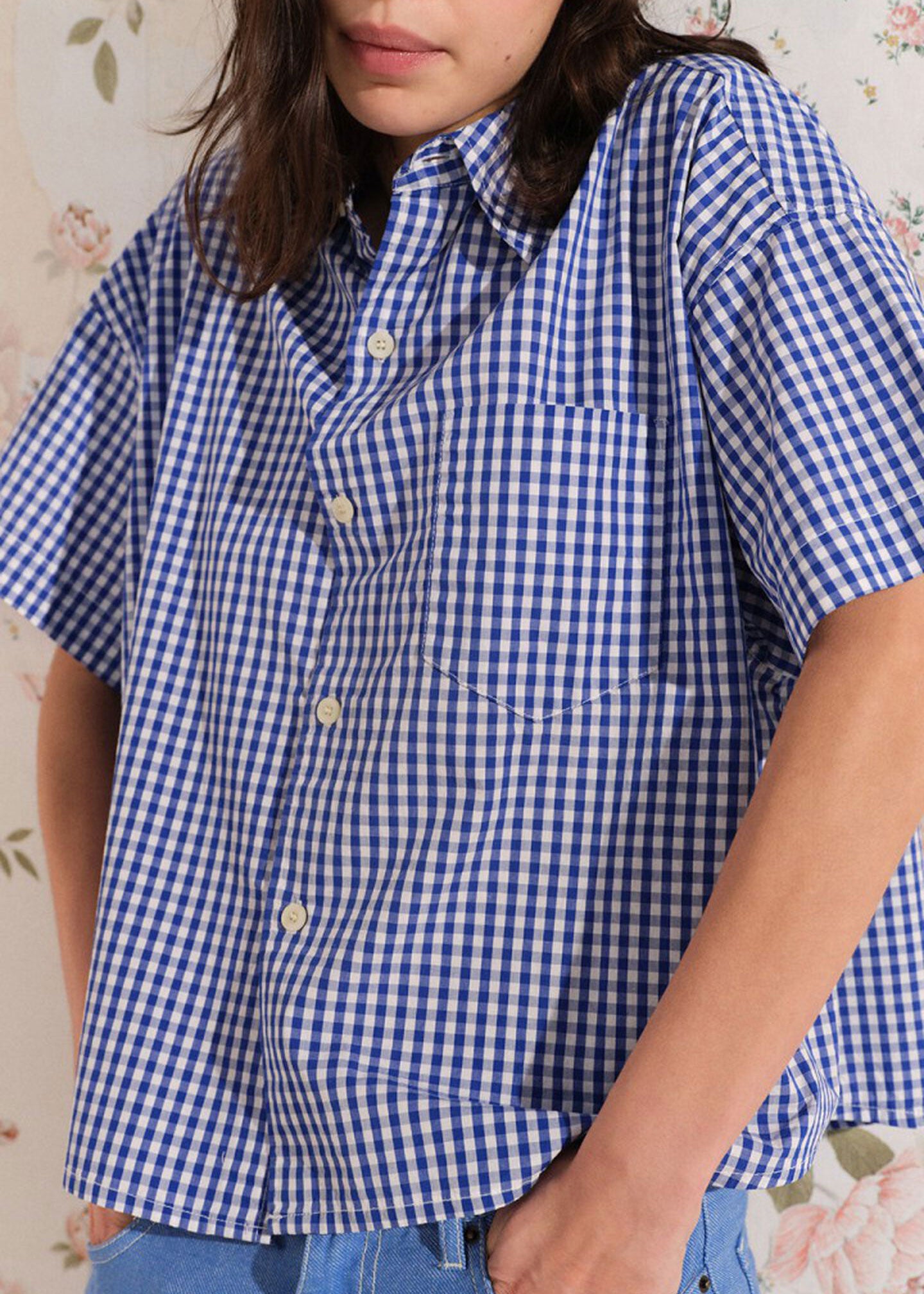 Short loose short-sleeve button-down collar shirt.