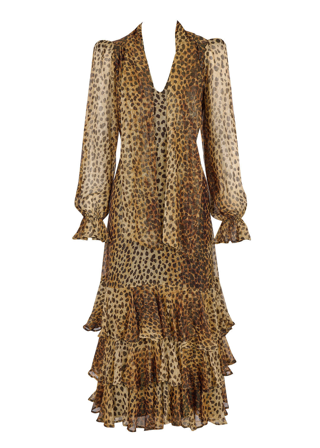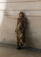 Farrah moves with untamed elegance, her cheetah print lurex chiffon catching the light in a slow, liquid shimmer. The cascading skirt sweeps the floor in rhythmic waves, while the languid self-tie neck drapes with effortless 70s glamour.