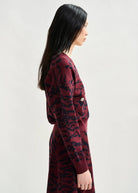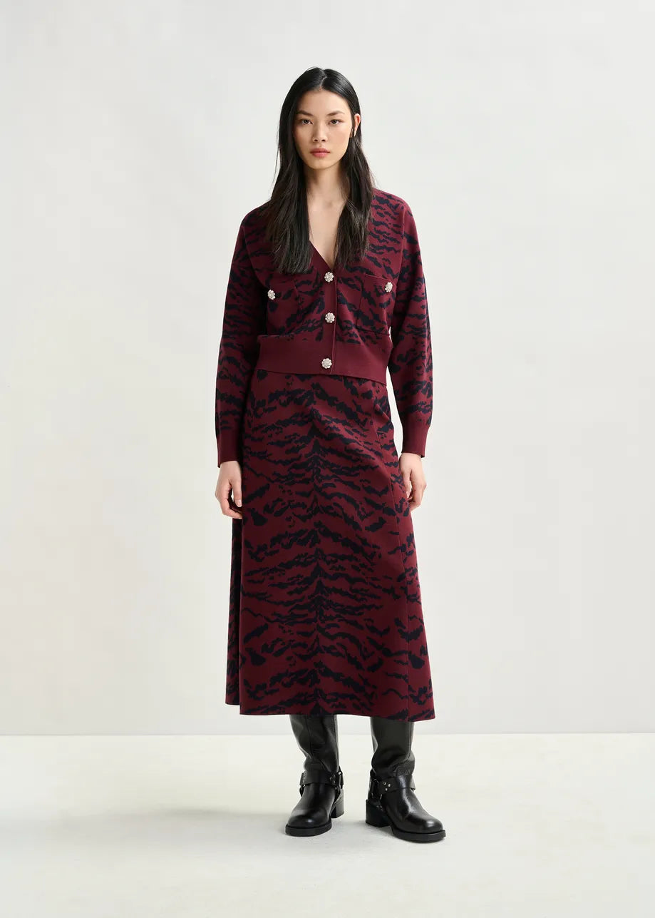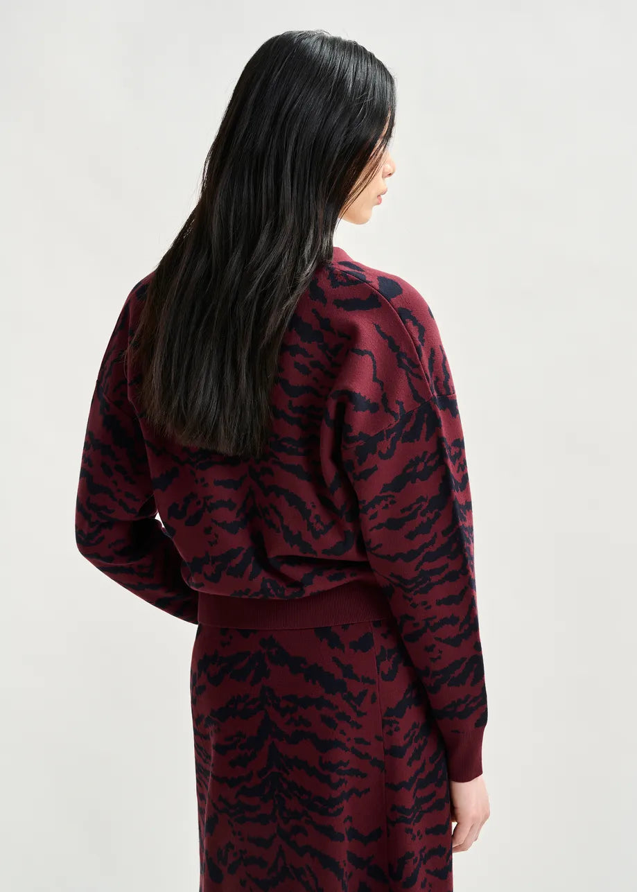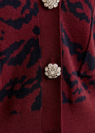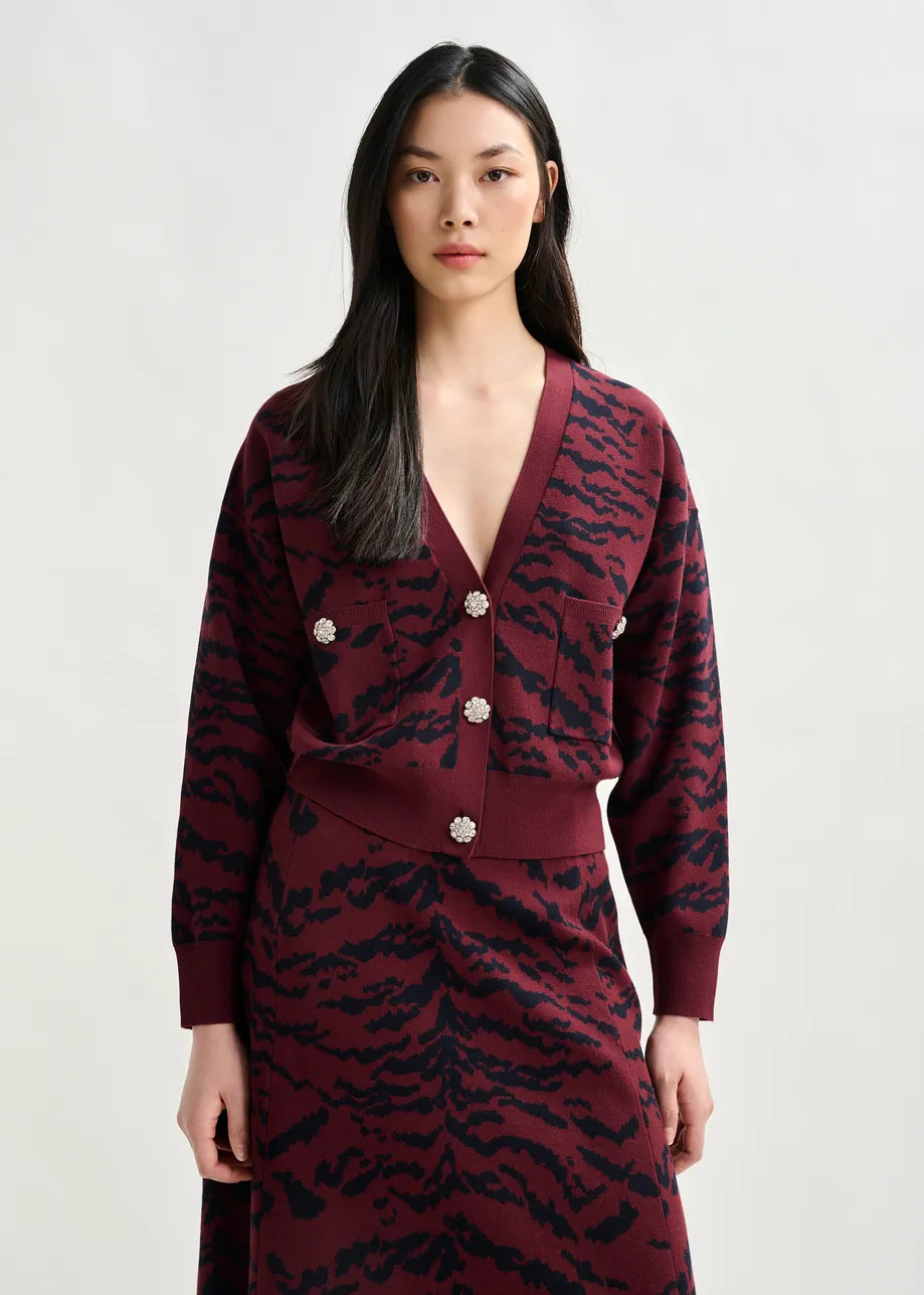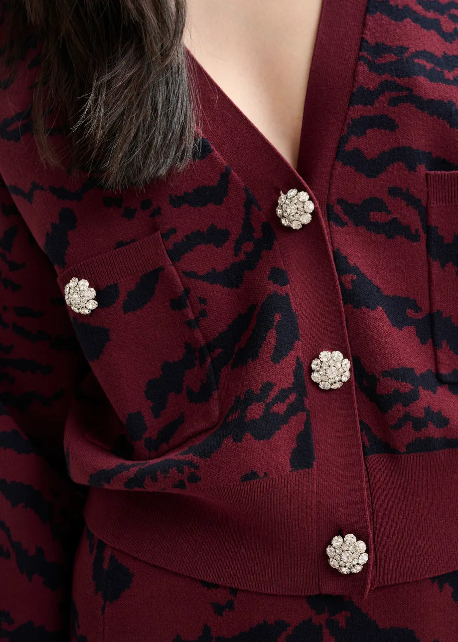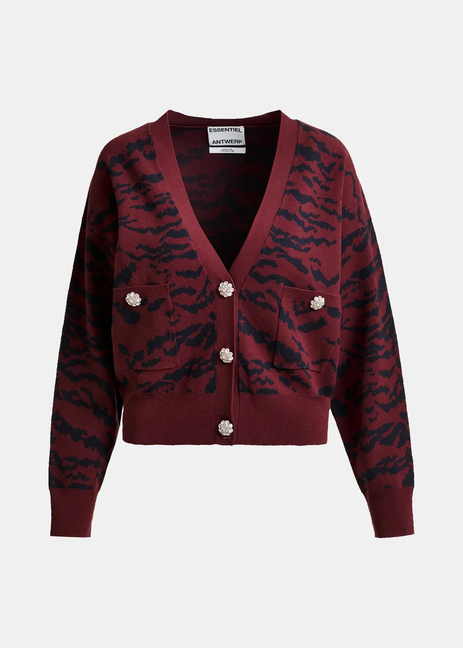 ESSENTIEL ANTWERP Burgundy tiger-print cardigan with rhinestone encrushed buttons