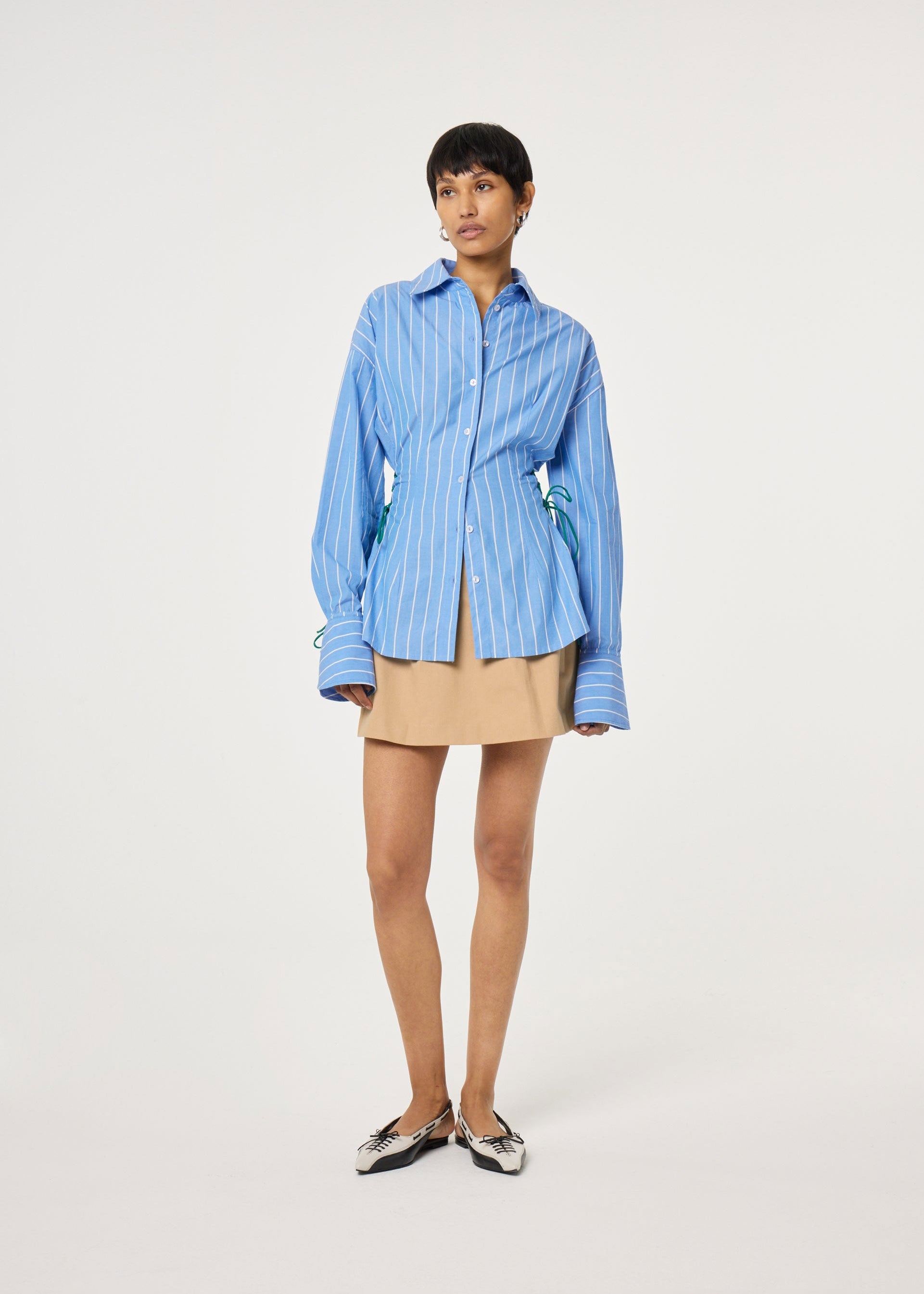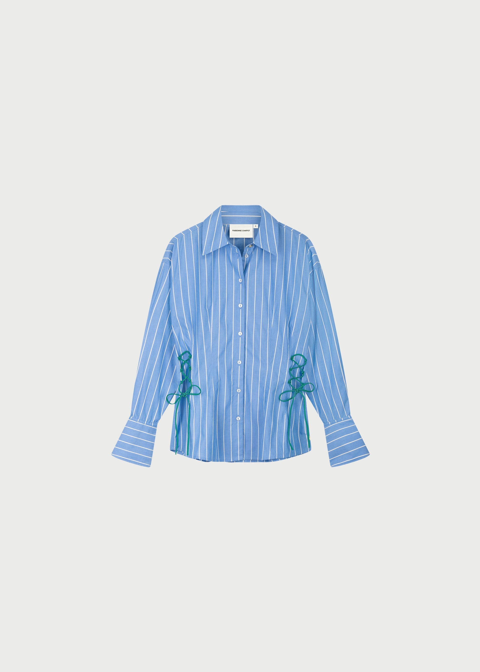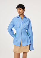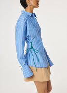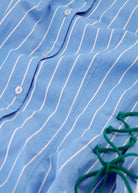 This slim-fit blouse made out of 100% organic cotton features blue and white stripes with a playful green lace detail on the sides, adding a fun twist to a classic. Lightweight and flattering, it’s perfect for everyday wear or casual outings.