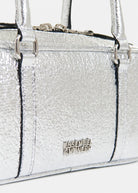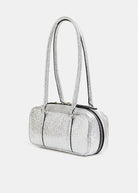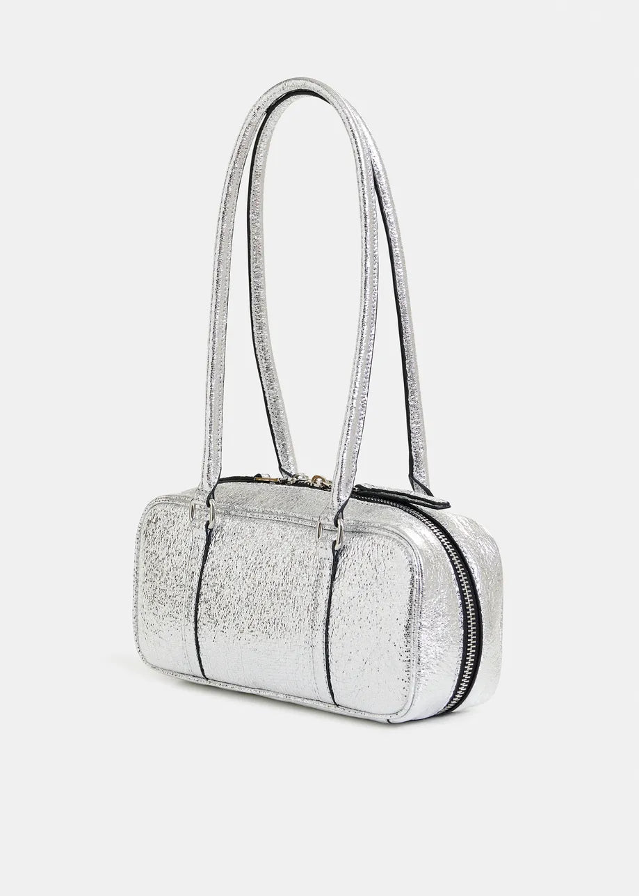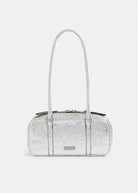 Metallic silver shoulder bag is crafted from a textured finish. Its compact baguette silhouette and structured shape offer a secure zip-top closure keeps your essentials safe, while the long shoulder straps make it comfortable to carry all day or night. Designed with protective metal feet to prevent wear on the base, its finished with a lined interior, silver hardware, and a subtle logo accent for a polished touch.