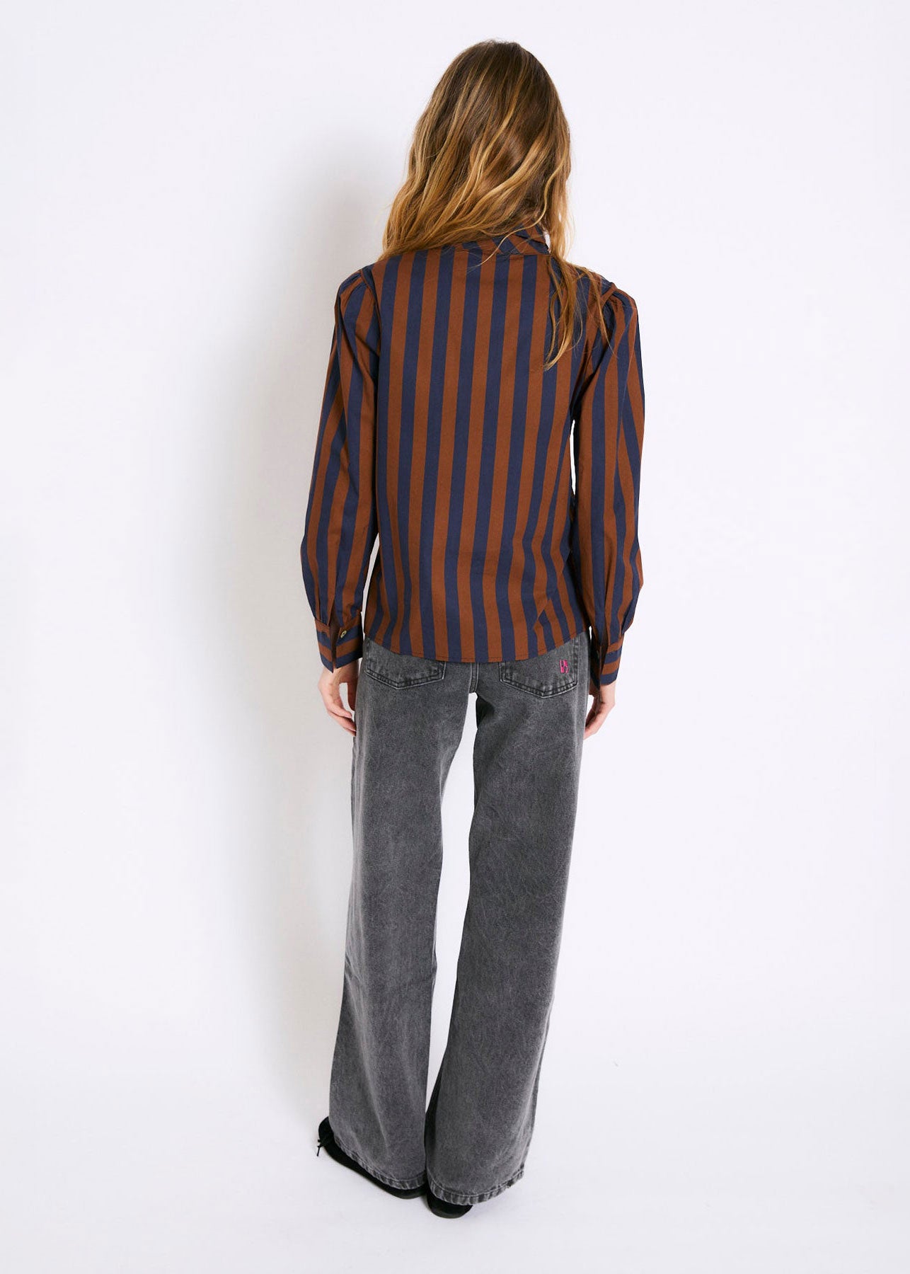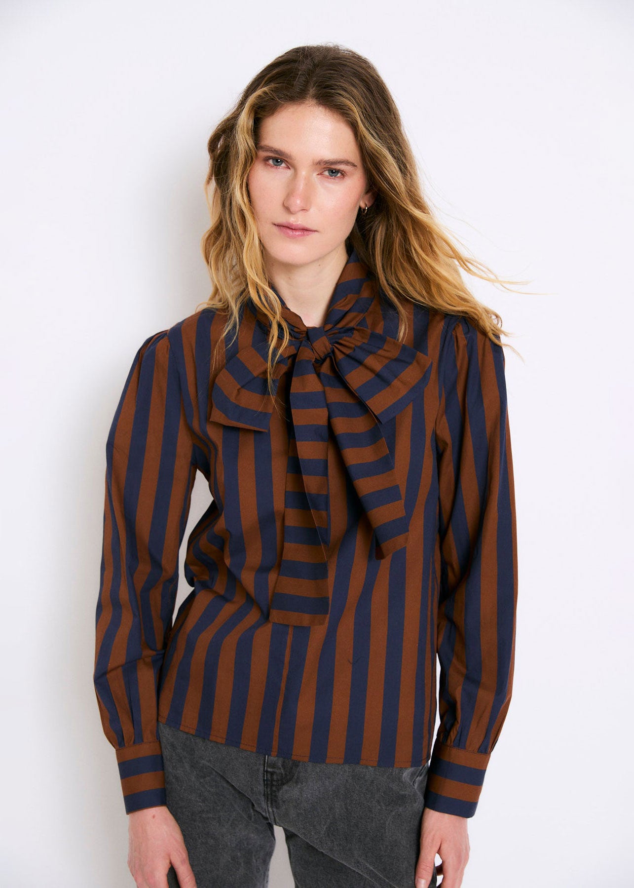 Navy blue and brown striped blouse. It features a large bow at the neck that adds a sophisticated, retro touch. Straight cut, it has long, slightly puffed sleeves with defined cuffs. The flowing fabric and contrasting colours give it an elegant yet distinctive character.