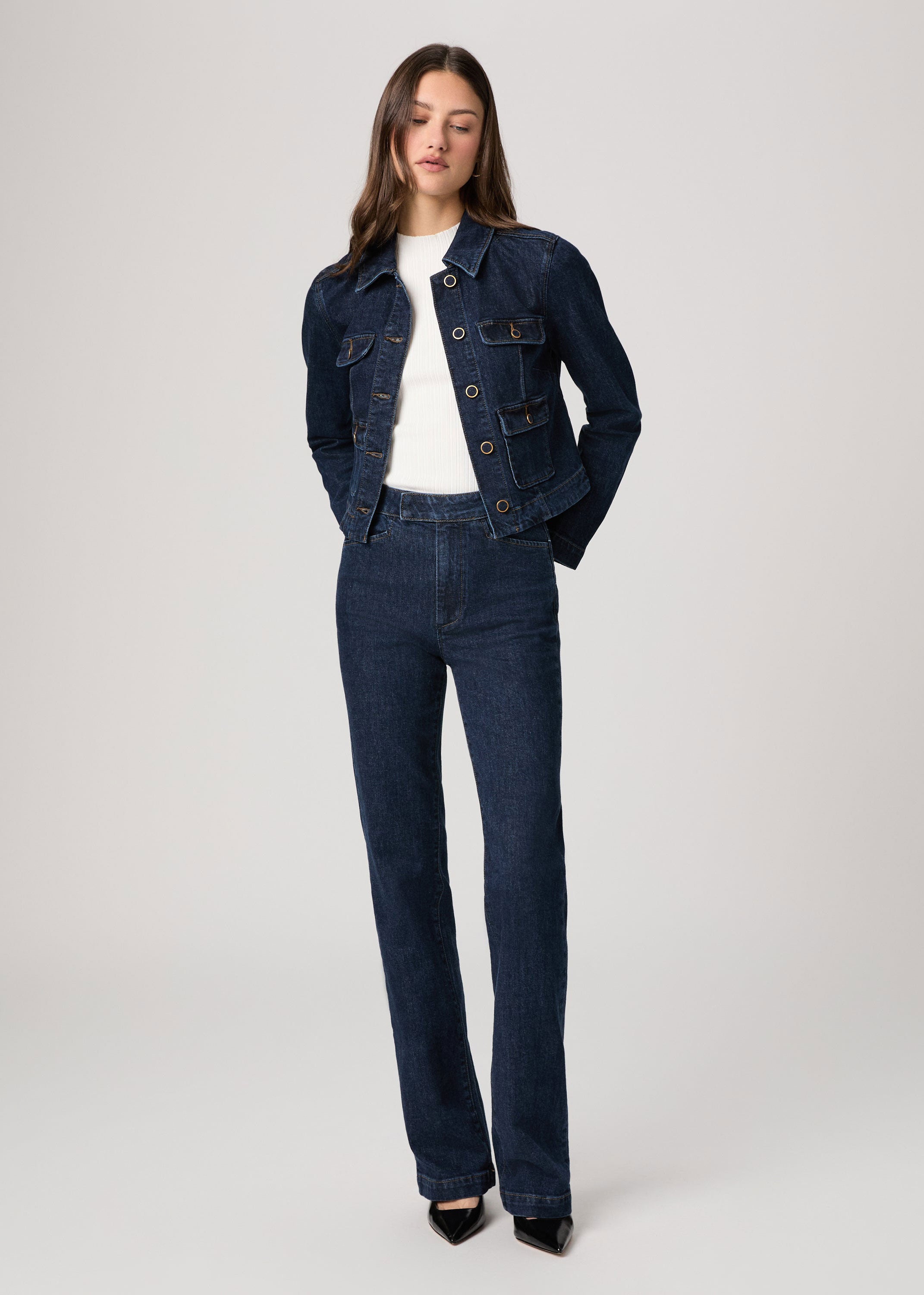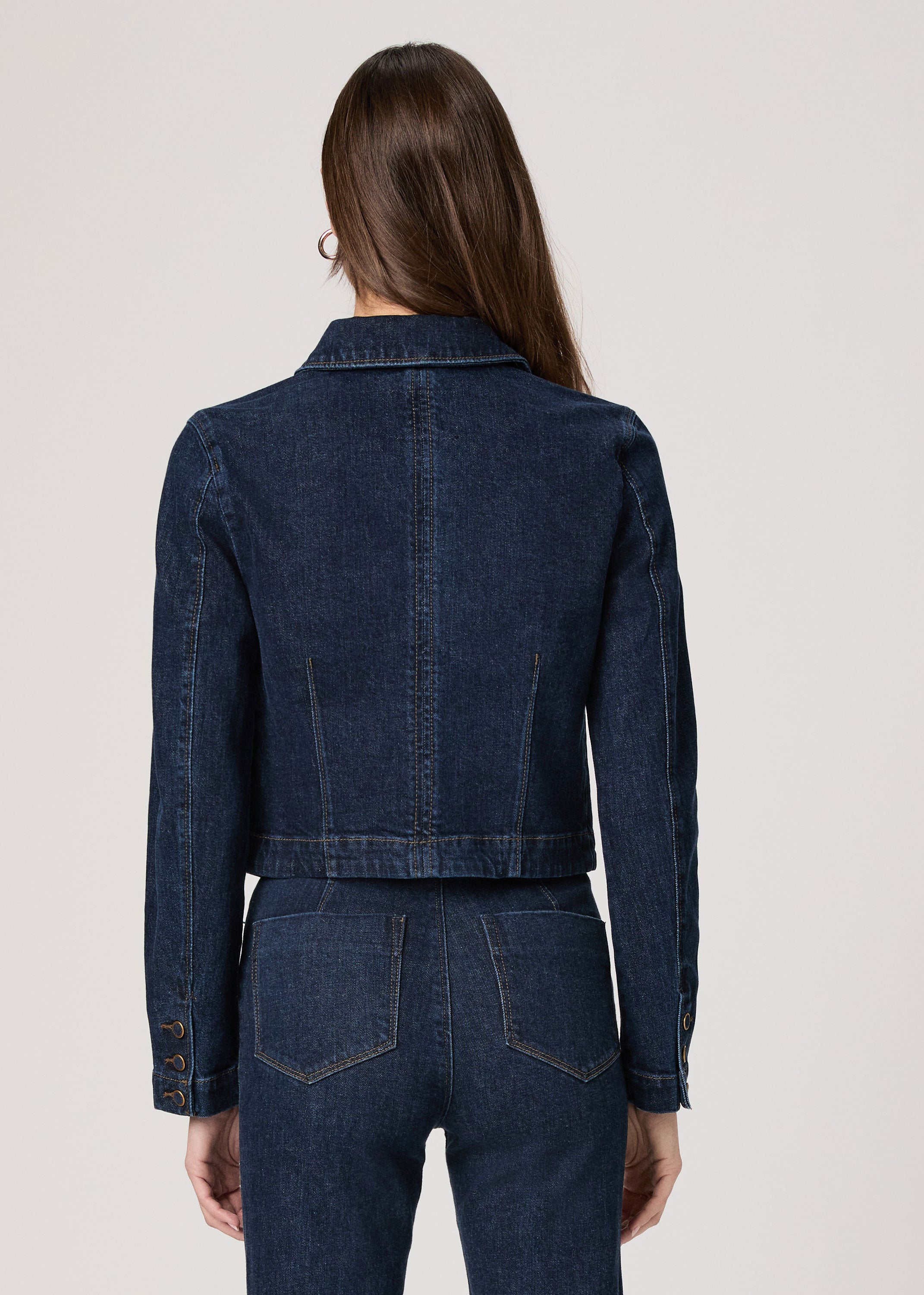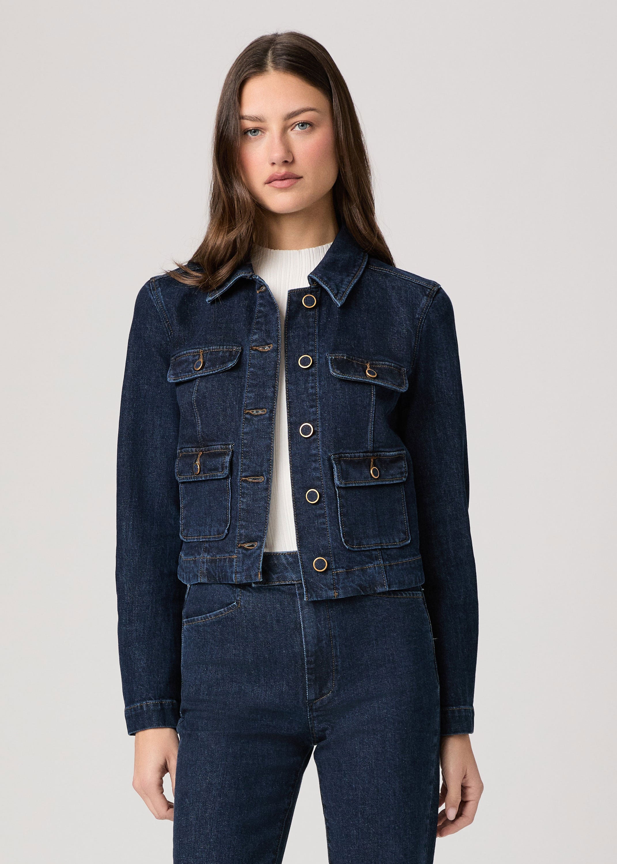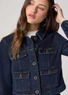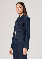 In an elevated dark indigo wash with four front pockets accented with self-covered vintage gold trim buttons and brown contrast stitching, this classic denim jacket is crafted from heritage-inspired denim with a soft hand-feel and a hint of stretch. Pair the Lydia Jacket with the matching Camille Short or Stevie Boot Trouser for a chic double denim moment.