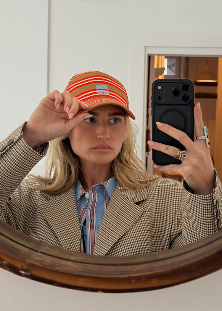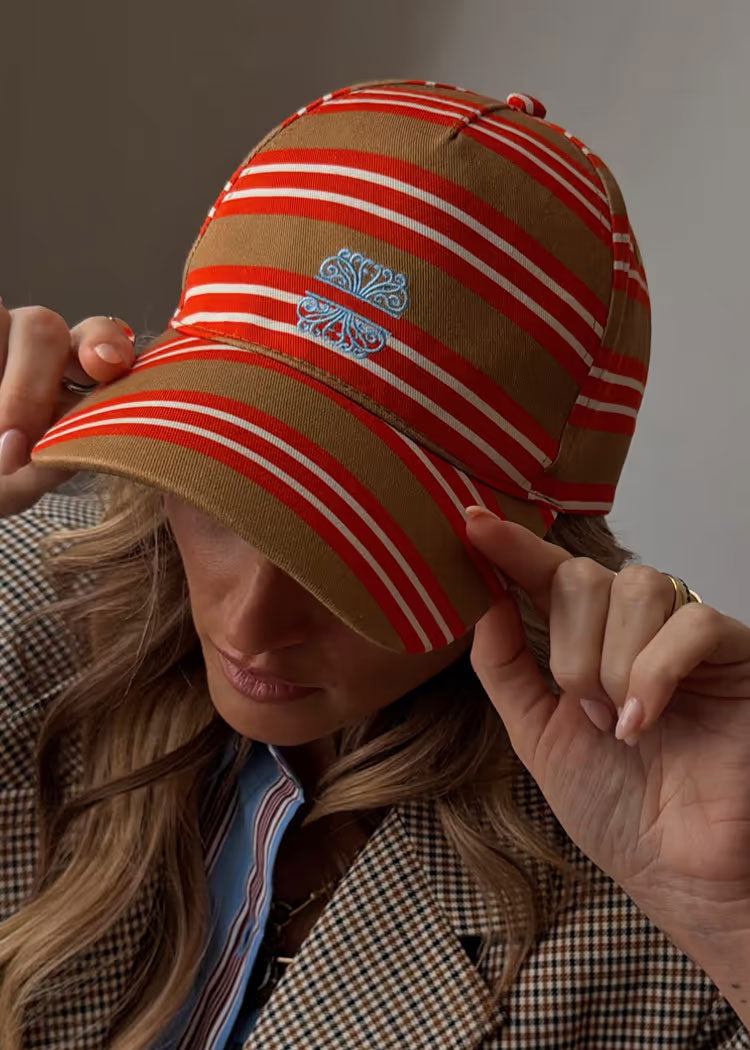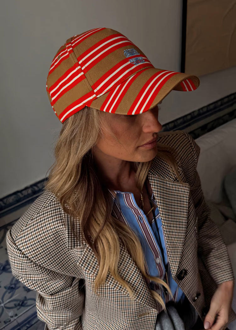 A classic cap in our bright and bold red stripe print on a tan brown base. Featuring our embroidered NFD logo, in a contrast baby blue, on the front.