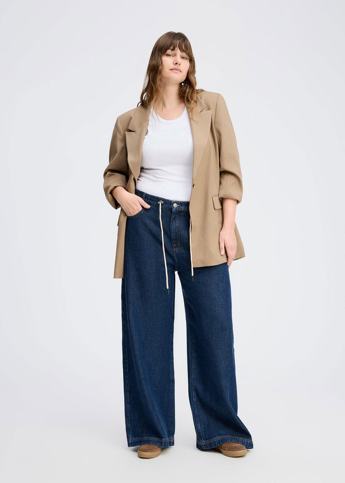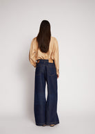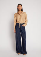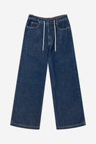 Dark blue jeans, designed with an elegant tie string detail at the waist. These pants have a loose fit, wide legs, and front and back pockets.