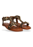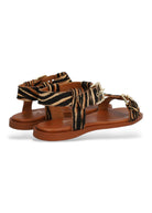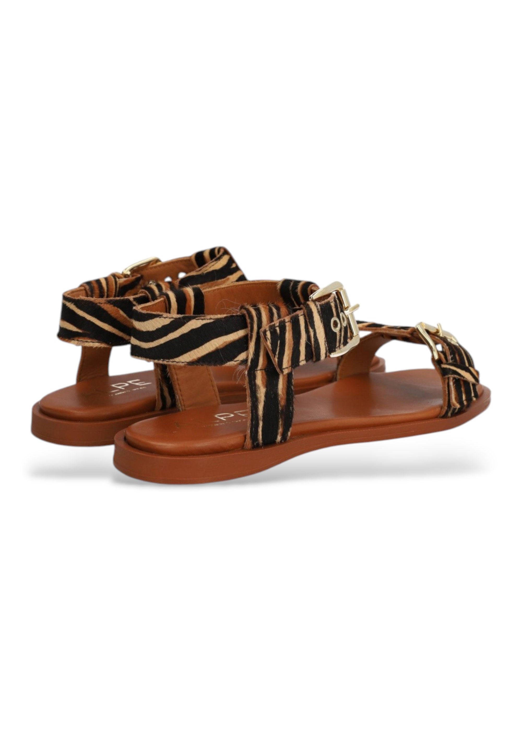 A flat sandal by Alpe that makes animal print its raison d'être. The tiger print pony hair straps - a combination of black, camel and beige - make this flat the most daring and feminine accessory of the season. Its large-format golden double buckles add a point of controlled opulence that perfectly balances the intensity of the print, creating that wild-refined contrast that defines contemporary luxury.