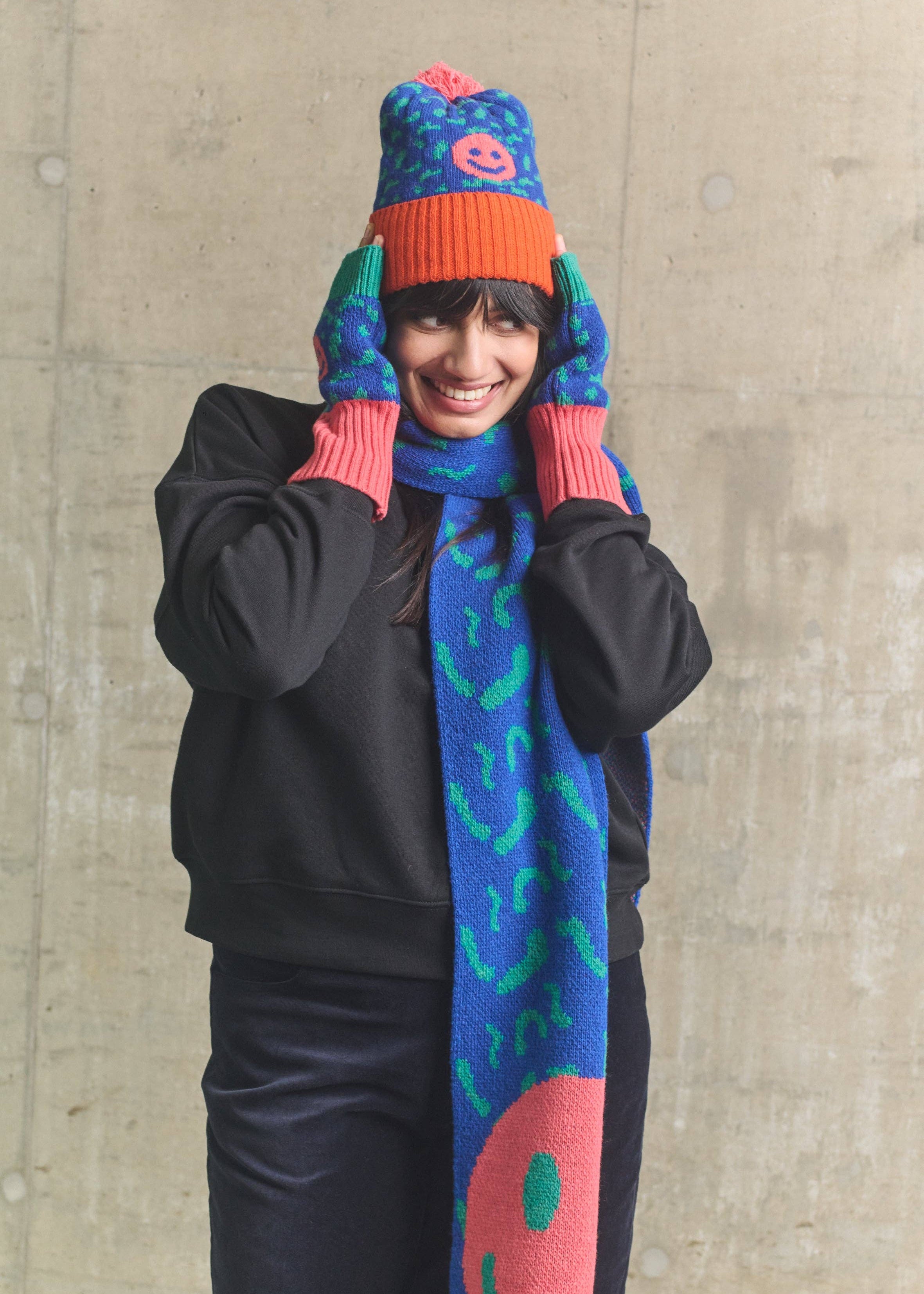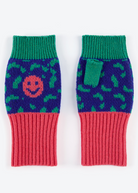 Keep cosy while spreading good vibes with the Smiley Fingerless Wool Gloves. A cobalt blue base is sprinkled with green squiggles, finished with bold coral cuffs and cheerful green trims. On the front, a bright coral smiley face beams out – a joyful reminder to stay light and positive even on the chilliest days.