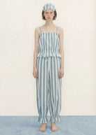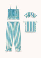 Cotton poplin pyjama set including top, pants, eye mask, and bag. Off-white base with printed retro stripes. Strapped top with elastic frill detailing. Pants with elasticated waistband and frilled hem. Padded eye mask with embroidered logo and small frill. Bag for packing the set. Carefully designed in Barcelona. Crafted in India.
