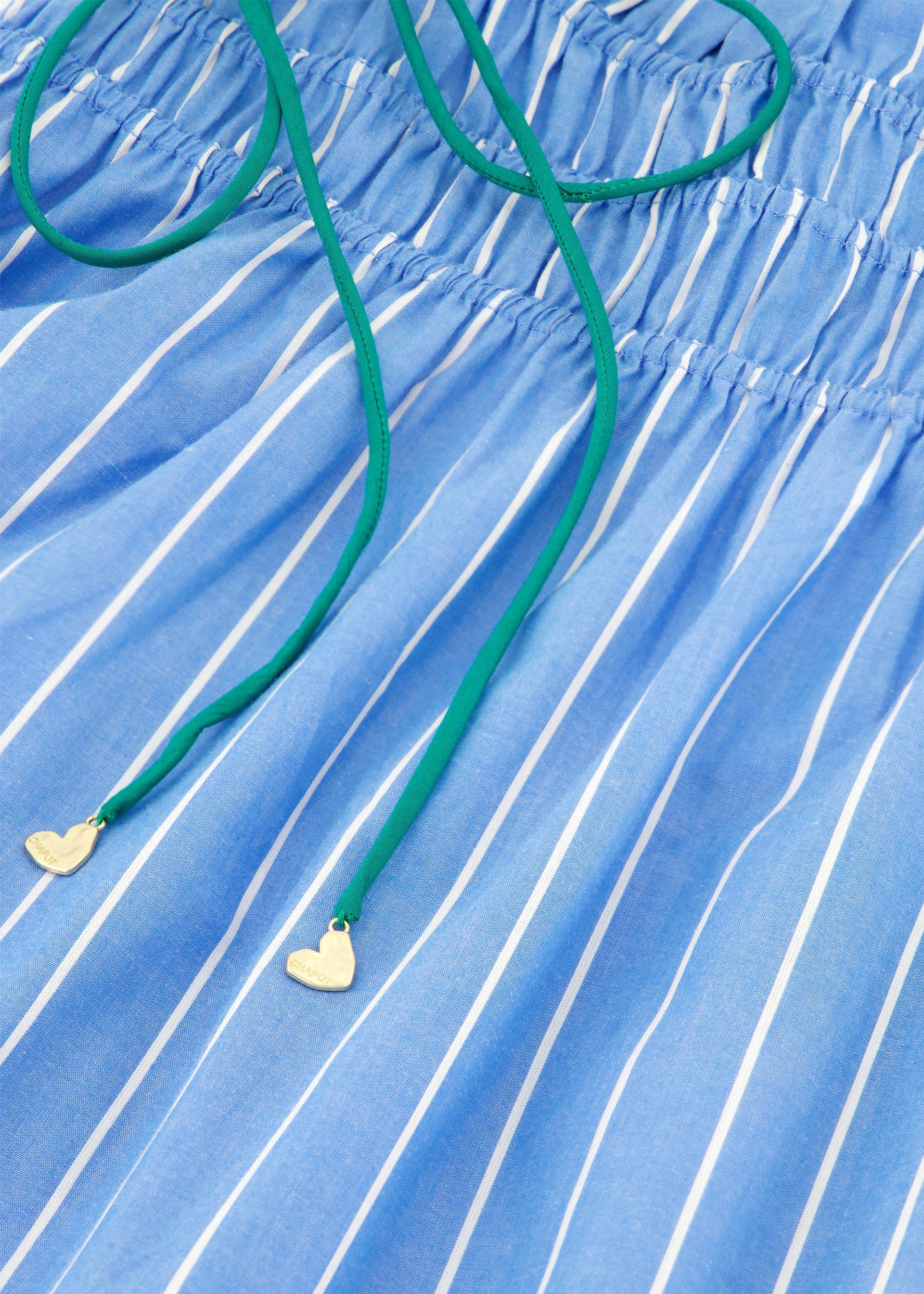 This blue and white striped skirt is crafted from 100% organic cotton for a soft, breathable feel. Designed with a regular fit, it features non-adjustable green ribbons on the sides, finished with delicate bead details for a playful touch. Perfect for sunny days or casual outings, and pairs effortlessly with the John top for a complete look.